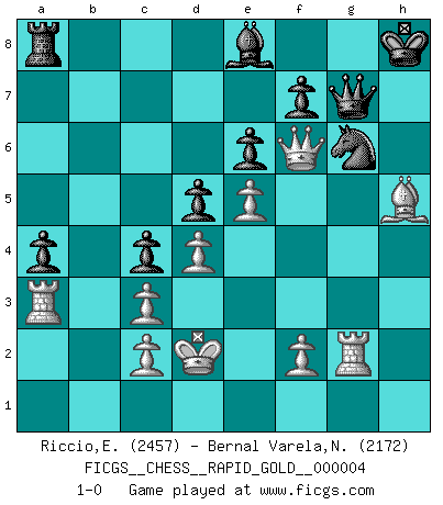 Last move : 1-0 2017 September 14 6:57:34 [Event "FICGS__CHESS__RAPID_GOLD__000004"] [Site "FICGS"] [Date "2017.05.31"] [Round "2"] [White "Riccio,Eros"] [Black "Bernal Varela,Nelson"] [Result "1-0"] [WhiteElo "2457"] [BlackElo "2172"] 1.e4 e6 2.d4 d5 3.Nc3 Nf6 4.Bg5 Bb4 5.e5 h6 6.Bd2 Bxc3 7.bxc3 Ne4 8.Qg4 Kf8 9.Bd3 Nxd2 10.Kxd2 c5 11.h4 c4 12.Be2 Nc6 13.Qf4 b5 14.a3 a5 15.Bh5 Ra7 16.Rb1 Ba6 17.Ne2 Kg8 18.g4 g6 19.g5 Qf8 20.Rbg1 b4 21.gxh6 Qxh6 22.Rg5 bxa3 23.Bf3 Qg7 24.Ng3 Ne7 25.Nh5 Rxh5 26.Bxh5 Bb5 27.Ra1 Be8 28.Rxa3 Ra8 29.Bf3 a4 30.h5 Kh7 31.hxg6+ Nxg6 32.Qf6 Kg8 33.Bh5 Kh8 34.Rg2 1-0 French : MacCutcheon, Lasker variation Player White won this chess game. Follow this game move after move (download)Fischer is an American Chess tragedy on par with Morphy and Pillsbury. (Mig Greengard) Alles was am Schachbrett zählt sind gute Züge. (Robert James Fischer) Bobby solo arroja las piezas y solas caen en las casillas correctas. (Miguel Najdorf ) 'L'échange des dames est un coup dur pour les deux adversaires...' Un journaliste lors d'une partie du match Spassky-Fischer Follow your passion, and success will follow you. (Arthur Buddhold)