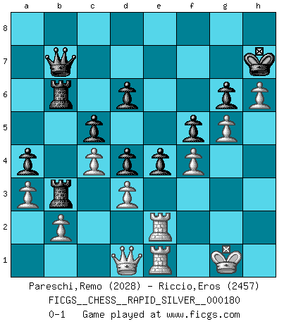 Last move : 0-1 2017 October 9 23:36:31 [Event "FICGS__CHESS__RAPID_SILVER__000180"] [Site "FICGS"] [Date "2017.06.01"] [Round "1"] [White "Pareschi,Remo"] [Black "Riccio,Eros"] [Result "0-1"] [WhiteElo "2028"] [BlackElo "2457"] 1.c4 e5 2.Nc3 Nf6 3.Nf3 Nc6 4.e4 Bb4 5.d3 d6 6.h3 O-O 7.Be2 Ne7 8.Qc2 Ng6 9.a3 Bxc3+ 10.Qxc3 c5 11.Be3 Ne8 12.h4 Ne7 13.h5 Nc6 14.Bg5 f6 15.Bc1 a5 16.Be3 Nc7 17.Bd1 Ne6 18.Nh4 a4 19.O-O Ncd4 20.Qd2 Bd7 21.Nf5 Nxf5 22.exf5 Nd4 23.g4 Bc6 24.h6 g6 25.Bxd4 cxd4 26.fxg6 hxg6 27.f4 Kh7 28.Bf3 Qd7 29.Kf2 f5 30.Bxc6 bxc6 31.g5 Rfe8 32.Rae1 c5 33.Kg1 Rab8 34.Rf2 e4 35.Rfe2 Rb3 36.Qd1 Reb8 37.Qc2 R8b6 38.Qd1 Qb7 0-1 English Opening Kingside Castling by player Black (move 6) Kingside Castling by player White (move 19) Player Black won this chess game. Follow this game move after move (download)One bad move nullifies forty good ones. (Horowitz) Es genügt nicht ein guter Spieler zu sein, man muß auch gut spielen. (Siegbert Tarrasch) El Ajedrez, como cualquier actividad creativa, solo puede existir a través del esfuerzo combinado de aquellos que tienen talento creativo y de aquellos que poseen la habilidad de organizar su trabajo creativo. (Mikhail Botvinnik) Les échecs, c'est l'imagination. (David Bronstein) Memory is a crazy woman that hoards colored rags and throws away food. (Austin O'Malley)