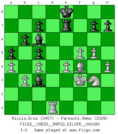 Last move : 1-0 2017 October 9 23:36:41 [Event "FICGS__CHESS__RAPID_SILVER__000180"] [Site "FICGS"] [Date "2017.06.01"] [Round "2"] [White "Riccio,Eros"] [Black "Pareschi,Remo"] [Result "1-0"] [WhiteElo "2457"] [BlackElo "2028"] 1.e4 e5 2.Nf3 Nc6 3.Bb5 Nge7 4.O-O Ng6 5.c3 Be7 6.d4 O-O 7.Bxc6 dxc6 8.Nxe5 Nxe5 9.dxe5 Qxd1 10.Rxd1 Bg4 11.Re1 b6 12.Be3 Bc8 13.Nd2 Bb7 14.Rad1 Rfd8 15.Nf1 Ba6 16.f3 c5 17.Rxd8+ Rxd8 18.Rc1 Rd3 19.c4 f6 20.exf6 Bxf6 21.b3 Kf7 22.Kf2 Bb2 23.Rc2 Be5 24.f4 Ba1 25.Kf3 Rd7 26.g4 Bb7 27.Ng3 Bc6 28.f5 a5 29.Rd2 Re7 30.a4 Re8 31.Bf4 Bc3 32.Rd1 Re7 33.g5 Ke8 34.h4 1-0 Ruy Lopez : Cozio defense Kingside Castling by player White (move 4) Kingside Castling by player Black (move 6) Player White won this chess game. Follow this game move after move (download)I feel as if I were a piece in a game of Chess, when my opponent says of it: That piece cannot be moved. (Soren Kierkegaard) Viele Opfer benötigen überhaupt keine konkrete Berechnung. Es genügt sich die entstehende Position kurz vorzustellen, um uns davon zu überzeugen, dass das Opfer korrekt ist. (Mikhail Nekhemyevich Tal) Los finales de Peón son del Ajedrez lo que el cesped es del Golf. (Cecil Purdy) À la honte des hommes, on sait que les lois du jeu sont les seules qui soient partout justes, claires, inviolables et exécutées. Pourquoi l'Indien qui a donné les règles du jeu d'échecs est-il obéi de bon gré dans toute la terre, et que les décrétales des papes, par exemple, sont aujourd'hui un objet d'horreur et de mépris ? C'est que l'inventeur des échecs combina tout avec justesse pour la satisfaction des joueurs, et que les papes, dans leurs décrétales, n'eurent en vue que leur seul avantage. L'Indien voulut exercer également l'esprit des hommes et leur donner du plaisir; les papes ont voulu abrutir l'esprit des hommes. Voltaire (Dictionnaire philosophique / Garnier 1967) Yoga is 99% practice and 1% knowledge. (Sri Krishna Pattabhi Jois)
