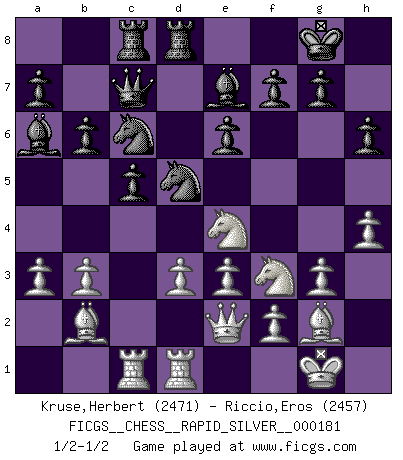 Last move : 1/2-1/2 2017 June 16 14:3:46 [Event "FICGS__CHESS__RAPID_SILVER__000181"] [Site "FICGS"] [Date "2017.06.01"] [Round "2"] [White "Kruse,Herbert"] [Black "Riccio,Eros"] [Result "1/2-1/2"] [WhiteElo "2471"] [BlackElo "2457"] 1.Nf3 d5 2.g3 c5 3.Bg2 Nf6 4.O-O e6 5.b3 Nc6 6.Bb2 Be7 7.e3 O-O 8.Qe2 b6 9.Rd1 Bb7 10.d3 Qc7 11.c4 Rac8 12.Nc3 Rfd8 13.Rac1 Qb8 14.cxd5 Nxd5 15.Ne4 Qc7 16.a3 Ba6 17.h4 h6 18.Rd2 Rd7 19.R2d1 R7d8 20.Rd2 Rd7 21.R2d1 R7d8 1/2-1/2 Reti : King's Indian attack Kingside Castling by player White (move 4) Kingside Castling by player Black (move 7) This chess game ended in a draw. Follow this game move after move (download)Discovered check is the dive bomber of the Chessboard. (Reuben Fine) Meine Liebe ist Schach, Schach, Schach. Ich muss jeden Tag Schach spielen, deshalb fühle ich mich so stark. (Miguel Najdorf) Cuando veas una buena jugada, trata de encontrar otra mejor. (Emanuel Lasker) Votre prénom est 'Tactique', votre deuxième prénom est 'Tactique' et votre nom est 'Tactique'. (Ken Smith) Perseverance does not equal worthiness. Next time you want to get my attention, wear something fun. Low-riding jeans are hot. (Gregory House, House M.D.)