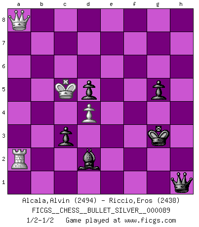 Last move : 1/2-1/2 2017 June 2 3:9:57 [Event "FICGS__CHESS__BULLET_SILVER__000089"] [Site "FICGS"] [Date "2017.06.02"] [Round "1"] [White "Alcala,Alvin"] [Black "Riccio,Eros"] [Result "1/2-1/2"] [WhiteElo "2494"] [BlackElo "2438"] 1.d4 d5 2.Bf4 Nf6 3.e3 c5 4.Nf3 Nc6 5.c3 Qb6 6.Qb3 c4 7.Qxb6 axb6 8.Na3 Bf5 9.Nh4 Bd7 10.Nf3 Ra5 11.Bc7 Ne4 12.Bxb6 Ra6 13.Bc7 Rxa3 14.bxa3 Nxc3 15.Kd2 Nb5 16.Bb6 Nxa3 17.Kc1 e6 18.Kb2 f6 19.Ne1 Bd6 20.Nc2 Nxc2 21.Kxc2 Kf7 22.Be2 e5 23.Kb2 Bf5 24.a3 Ra8 25.Rhd1 exd4 26.exd4 Be4 27.g3 Ra4 28.Re1 g6 29.Kc3 h5 30.h3 Bg2 31.g4 h4 32.Bf1 Bf3 33.Kb2 Ra6 34.Bc5 Bf4 35.Be2 Bg2 36.Kc3 b6 37.Bb4 g5 38.Bf1 Bxf1 39.Rxf1 f5 40.gxf5 Kf6 41.Rfe1 Kxf5 42.f3 Ra4 43.Bf8 Ra8 44.Bb4 Bg3 45.Re2 Bc7 46.Re3 Ra4 47.Bf8 Ra8 48.Bb4 Kf4 49.Re6 Nxb4 50.Kxb4 Kxf3 51.a4 Kg2 52.Ra3 Bg3 53.Rg6 Bf4 54.Kb5 Rc8 55.Kxb6 c3 56.Rc6 Rxc6+ 57.Kxc6 Bd2 58.Ra2 Kxh3 59.a5 Kg3 60.a6 h3 61.a7 h2 62.a8Q h1Q 63.Kc5 1/2-1/2 Queen's pawn, Mason variation 10 pieces endgame at move 58 : White KRPP , Black KBPPPP WHITE : King + 1 Rook 2 Pawns BLACK : King + 1 Bishop 4 Pawns Promotion Queen by player White (move 62) Promotion Queen by player Black (move 62) This chess game ended in a draw. Follow this game move after move (download)My opponents make good moves too. Sometimes I don't take these things into consideration. (Bobby Fischer) Es ist im Leben wie im Schachspiel. Wir entwerfen einen Plan, dieser bleibt jedoch bedingt durch das, was im Schachspiel dem Gegner, im Leben dem Schicksal zu tun belieben wird. (Arthur Schopenhauer) Un sacrificio se refuta mucho mejor al aceptarlo. (Wilhelm Steinitz) La vie est comme un jeu d'échecs : nous esquissons un plan, mais celui-ci est tributaire de ce que daignent faire l'adversaire aux échecs et le destin dans la vie. (Arthur Schopenhauer) You have to believe in yourself. (Sun Tzu)