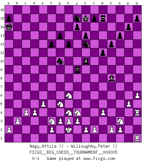 Last move : 0-1 2007 October 5 17:30:0 [Event "FICGS__BIG_CHESS__TOURNAMENT__000005"] [Site "FICGS"] [Date "2007.04.08"] [Round "1"] [White "Nagy,Attila"] [Black "Willoughby,Peter"] [Result "0-1"] [WhiteElo ""] [BlackElo ""] 1.j2-h4 d15-d13 2.h1-o7 p16-o14 3.o7-f15 e16-d16 4.f15-o7 k16-l14 5.o7-c7 h15-j13 6.c7-c15 d16-e16 7.c15-k8 n15-n13 8.p2-p3 e15-e13 9.o1-p2 g16-f14 10.m2-m4 f14-g12 11.p2-d13 o16-h10 12.k8-a8 j16-k16 13.e2-e4 b16-c14 14.d2-d4 e16-d16 15.a8-j8 m15-m13 16.c2-c3 g12-e11 17.d13-c14 b15-c14 18.j8-c14 c16-d15 19.c14-h9 e11-g12 20.f1-a6 l16-n14 21.l1-p5 g15-g13 22.p1-o3 m13-m12 23.h9-k7 m16-m13 24.c1-f4 m13-k13 25.k7-p7 o14-p12 26.g1-j2 h16-f14 27.f4-g3 h14-h13 28.a6-e2 j13-k11 29.p7-p6 f16-l11 30.e2-p12 p15-p14 31.p12-n10 k13-j13 32.b1-d2 q16-m16 33.e4-e5 h13-h12 34.k1-l3 d15-a12 35.h2-j4 d16-d10 36.n10-l8 g12-j11 37.p6-h6 h10-f12 38.h6-b6 k15-k13 39.b6-b15 f14-d16 40.b2-b3 k11-j9 41.l8-p4 n14-j10 42.p4-j10 d10-j10 43.p5-o4 j9-l10 44.o4-f12 e13-f12 45.d2-f3 k16-k15 46.e1-e4 d16-b14 47.b15-n4 o15-o13 48.j1-h2 a12-c14 49.n4-o5 j10-c10 50.c3-c4 c14-j8 51.e4-g4 j8-k9 52.o5-q7 m16-m15 53.m1-m3 b14-e14 54.q7-q10 a16-c16 55.m3-n3 l10-n9 56.h4-k5 c10-q10 57.q2-q4 q10-g10 58.g4-g10 j11-g10 59.q4-q5 c16-c8 60.q5-q6 k9-j8 61.g3-n9 l11-n9 62.g2-g3 n9-l11 63.q1-q5 j8-l10 64.q5-q2 c8-f8 65.j2-h4 l14-k12 66.j4-g5 m12-m11 67.l3-j4 n13-n12 68.q2-q4 f8-q8 69.a1-q1 j13-j9 70.p3-p4 l11-k10 71.p4-p5 q8-n8 72.n3-n8 l10-n8 73.k5-h6 e14-a14 0-1 This big chess game has been lost on time (started : 2007.04.08 0:40:31) Follow this game move after move (download)Strategy requires thought, tactics require observation. (Max Euwe) Immer nach dem besten Zug zu suchen ist ziemlich unpraktisch. (Nigel Short) Un buen sacrificio es aquel que aunque no sea necesariamente sólido, deja a tu oponente aturdido y confuso. (Rudolph Spielmann) Seul un grand joueur sait à quel point il joue faiblement. (Xavier Tartacover) Man is reluctant to give credit for intelligence to anyone, except his enemies. (Albert Einstein)