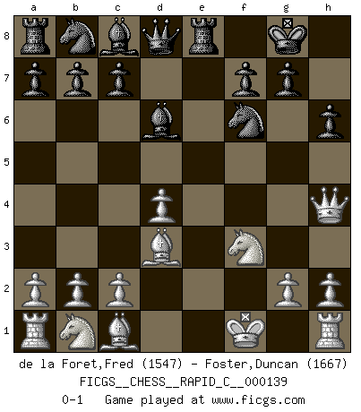 Last move : 0-1 2017 July 17 12:4:48 [Event "FICGS__CHESS__RAPID_C__000139"] [Site "FICGS"] [Date "2017.06.02"] [Round "1"] [White "de la Foret,Fred"] [Black "Foster,Duncan"] [Result "0-1"] [WhiteElo "1547"] [BlackElo "1667"] 1.e4 e5 2.f4 exf4 3.Nf3 Be7 4.d4 d5 5.Qe2 dxe4 6.Qxe4 Nf6 7.Qxf4 O-O 8.Bd3 Bd6 9.Qh4 Re8+ 10.Kf1 h6 0-1 This chess game has been lost on time (started : 2017.06.02 2:45:18) KGA : Cunningham defense Kingside Castling by player Black (move 7) Player Black won this chess game. Follow this game move after move (download)Of all my Russian books, the defense contains and diffuses the greatest 'warmth' which may seem odd seeing how supremely abstract Chess is supposed to be. (Vladimir Nabokov) Der Traum, für den ich lebe, ist der von einem freien Russland. Viele mögen sagen: Russland hat doch ein Parlament, einen gewählten Präsidenten. Aber ich spüre, dass in meiner Heimat die Angst wiederkehrt. Eine Angst, sich frei zu äußern, bestimmte Dinge zu tun (Garry Kasparov) El Ajedrez es como la guerra en un tablero. (Bobby Fischer) Les erreurs sont comme les malheurs, elles n'arrivent jamais seules. (Siegbert Tarrasch) Don't be irreplaceable, if you can't be replaced, you can't be promoted. (Dan Rotaru)