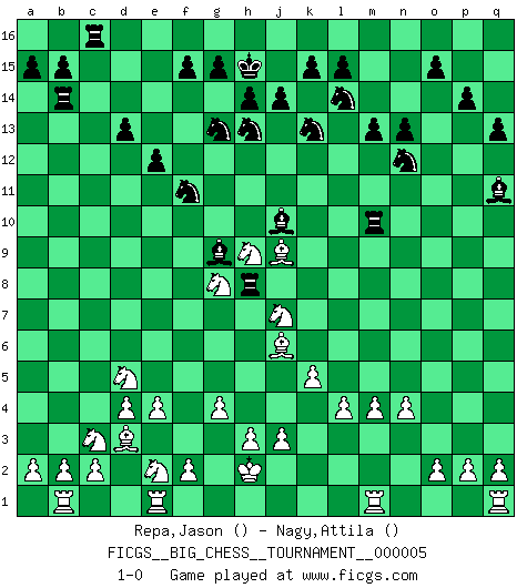 Last move : 1-0 2007 September 30 16:40:57 [Event "FICGS__BIG_CHESS__TOURNAMENT__000005"] [Site "FICGS"] [Date "2007.04.08"] [Round "1"] [White "Repa,Jason"] [Black "Nagy,Attila"] [Result "1-0"] [WhiteElo ""] [BlackElo ""] 1.j2-k4 p16-o14 2.h1-o7 h15-g13 3.m2-m4 d15-d13 4.o7-l7 k16-l14 5.l7-c15 b16-c14 6.c15-g11 j15-k13 7.p1-o3 g16-f14 8.n2-n4 h16-o10 9.h2-g4 e15-e13 10.d2-d4 n15-n13 11.b1-c3 m15-m13 12.c1-k8 c16-l8 13.k1-h2 f16-d14 14.g11-b11 a16-b16 15.e2-e4 l16-o13 16.g1-j2 o16-k12 17.l1-o4 q15-q13 18.b11-d11 e13-e12 19.d11-e10 o10-e10 20.o1-e10 d14-k8 21.o4-k8 b16-c16 22.h2-j4 c14-d12 23.e10-j6 l8-k9 24.f1-d3 c16-c8 25.k8-p3 j16-h15 26.j2-h4 k12-b4 27.j4-h6 d12-f11 28.h4-f5 e16-c16 29.j1-h2 c16-c14 30.g4-e3 m16-c16 31.e3-d5 b4-f8 32.g2-g4 c14-b14 33.a1-b1 c16-c14 34.k4-h5 q16-c16 35.h5-f4 c14-c10 36.f4-e2 p15-p14 37.o3-n5 c10-l10 38.l2-l3 l10-f10 39.h6-g8 f10-k10 40.k2-k4 f14-h13 41.n5-l6 c8-c6 42.k4-k5 o14-n12 43.l3-l4 o13-q11 44.l6-j7 k9-j10 45.g8-f10 f8-g9 46.f10-h9 k10-m10 47.f5-e7 c6-h6 48.e7-g8 h6-h8 49.p3-j9 1-0 This big chess game has been lost on time (started : 2007.04.08 0:40:31) Follow this game move after move (download)Weak points or holes in the opponent's position must be occupied by pieces not Pawns. (Siegbert Tarrasch) Der Partner hat auch seine Existenzberechtigung. (Savielly Grigorievitsch Tartakower) Mi estilo es algo parecido entre un poco de Tal y Petrosian. (Reshevsky) Celui qui prend des risques peut perdre, celui qui n'en prend pas perd toujours. (Xavier Tartacover) If you are going through hell, keep going. (Winston Churchill)