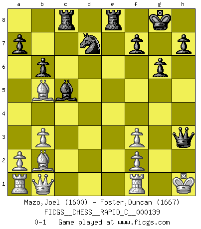 Last move : 0-1 2017 August 6 14:44:44 [Event "FICGS__CHESS__RAPID_C__000139"] [Site "FICGS"] [Date "2017.06.02"] [Round "1"] [White "Mazo,Joel"] [Black "Foster,Duncan"] [Result "0-1"] [WhiteElo "1600"] [BlackElo "1667"] 1.d4 b6 2.Nf3 Bb7 3.Nbd2 e6 4.e3 d6 5.Bd3 Nf6 6.O-O Be7 7.e4 O-O 8.c3 Nbd7 9.Qc2 e5 10.Rd1 c5 11.b3 cxd4 12.cxd4 Rc8 13.Qb1 exd4 14.Nxd4 Ng4 15.Bb2 g6 16.Nc4 d5 17.exd5 Qc7 18.Nf3 Bxd5 19.Ncd2 Bc5 20.Rf1 Rfe8 21.h3 Nge5 22.Bb5 Nxf3+ 23.Nxf3 Bxf3 24.gxf3 Qg3+ 25.Kh1 Qxh3+ 0-1 Queen's pawn : English defense Kingside Castling by player White (move 6) Kingside Castling by player Black (move 7) Player Black won this chess game. Follow this game move after move (download)If a ruler does not understand Chess, how can he rule over a kingdom ? (King Khusros II) Rubinstein ist ein Turmendspiel, welches die Götter vor tausenden von Jahren begannen. (Savielly Grigorievitsch Tartakower) No hay un Gran Maestro de Ajedrez que sea normal; solo se diferencían ellos por la magnitud de su locura. (Viktor Korchnoi) Dans le domaine de la peinture, de la gravure et de la sculpture, dès la première décennie de notre siècle, les artistes abandonnent la représentation de la partie d'échecs pour se concentrer sur les pièces, sur les échiquiers et sur toutes les variations auxquelles les unes et les autres peuvent donner lieu. On passe en quelque sorte d'un thème social à un thème musical (au sens de la musica médiévale, c'est-à-dire d'une notion qui inclue le rythme, l'harmonie, la construction et la déconstruction, etc.). Graphiquement et picturalement, l'échiquier apparaît comme une structure ouverte, dynamique, d'une richesse infinie, autorisant toutes les combinatoires et débouchant sur des mouvements et des rythmes de nature exponentielle. (Michel Pastoureau) Establishing goals is all right if you don't let them deprive you of interesting detours. (Doug Larson)