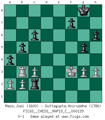 Last move : 0-1 2017 October 4 22:8:41 [Event "FICGS__CHESS__RAPID_C__000139"] [Site "FICGS"] [Date "2017.06.02"] [Round "1"] [White "Mazo,Joel"] [Black "Duttagupta,Aniruddha"] [Result "0-1"] [WhiteElo "1600"] [BlackElo "1786"] 1.d4 d5 2.e3 c6 3.Nf3 Bg4 4.Nbd2 e6 5.c3 Nf6 6.Bd3 Bd6 7.Qc2 Nbd7 8.O-O Qc7 9.h3 Bxf3 10.Nxf3 e5 11.dxe5 Nxe5 12.Nxe5 Bxe5 13.Re1 O-O 14.e4 Rae8 15.Bg5 Nxe4 16.Bxe4 dxe4 17.Rxe4 h6 18.Rh4 Re6 19.Rd1 Rfe8 20.Be3 Bf6 21.Rg4 Bg5 22.Re1 Bxe3 23.fxe3 Rxe3 24.Rxe3 Rxe3 25.Qf2 Qe5 26.Qf4 Re1+ 27.Kh2 Qxf4+ 28.Rxf4 Re2 29.Rb4 b5 30.Kg3 g5 31.Kf3 Rc2 32.g3 a5 33.Rb3 a4 0-1 This chess game has been lost on time (started : 2017.06.02 2:45:18) Queen's pawn game Kingside Castling by player White (move 8) Kingside Castling by player Black (move 13) Player Black won this chess game. Follow this game move after move (download)All my games are real. (Bobby Fischer) Ein Springer auf f6 gegen die eigene Rochadestellung ist schlimmer als ein rostiger Nagel im Knie. (Efim Bogoljubov) Fischer sacrificó virtualmente todo lo que la mayoría de nosotros los 'debiles' (término que él usa) valoramos, respetamos y apreciamos por el amor de un astuto, a menudo hermoso tablero de juego, por el privilegio ambivalente de ser su mas grande maestro. (Paul Kollar) On entre au jeu d'Echecs comme on entre en Religion. Pour le joueur d'Echecs, la partie d'Echecs c'est l'office, la messe, le défilé du 1er Mai, le dépôt de gerbe au Monument aux Morts. C'est un drame sacré. (Michel Roos) Vladimir Ras-Putin is still alive... He is also a good actor, I saw him in the Lord of the Rings. (Rodolfo d'Ettorre)