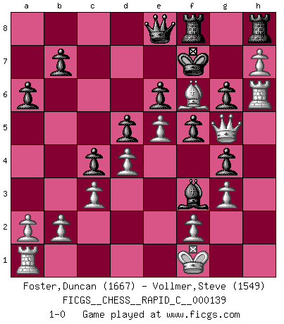 Last move : 1-0 2017 July 31 10:23:43 [Event "FICGS__CHESS__RAPID_C__000139"] [Site "FICGS"] [Date "2017.06.02"] [Round "1"] [White "Foster,Duncan"] [Black "Vollmer,Steve"] [Result "1-0"] [WhiteElo "1667"] [BlackElo "1549"] 1.e4 e6 2.d4 d5 3.e5 c5 4.c3 Nc6 5.Nf3 Qc7 6.Bd3 Nge7 7.Na3 a6 8.O-O Ng6 9.g3 Be7 10.h4 c4 11.Be2 f5 12.h5 Nf8 13.h6 g6 14.Nc2 Bd7 15.Ng5 Nd8 16.Ne1 Nf7 17.Nxf7 Kxf7 18.Bd2 g5 19.Bh5+ Ng6 20.Nf3 Qd8 21.Qc1 g4 22.Ng5+ Bxg5 23.Bxg5 Qb6 24.Bf6 Rhg8 25.Qg5 Raf8 26.Bg7 Qd8 27.Bxg6+ hxg6 28.Bf6 Qe8 29.Kg2 Ba4 30.Rh1 Bc2 31.Rh2 Be4+ 32.Kf1 Bf3 33.h7 Rh8 34.Rh6 1-0 French : Advance, Paulsen attack Kingside Castling by player White (move 8) Player White won this chess game. Follow this game move after move (download)Dazzling combinations are for the many, shifting wood is for the few. (Georg Kieninger) Auf Remis zu spielen ist gewissermaßen ein Verbrechen gegen das Schachspiel. (Mikhail Nekhemyevich Tal) Tu puedes aprender mucho mas de una partida que pierdas que de una partida ganada. Tendras que perder cientos de partidas antes de llegar a ser un buen jugador. (Jose Raul Capablanca) Des combinaisons [dans le jeu d'échecs] pareilles à des mélodies. Je crois entendre pour ainsi dire la musique des coups... (Vladimir Nabokov) There is a very easy way to return from a casino with a small fortune : go there with a large one. (Jack Yelton)
