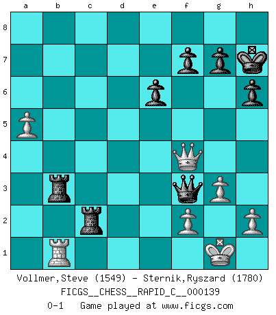 Last move : 0-1 2017 July 16 11:5:49 [Event "FICGS__CHESS__RAPID_C__000139"] [Site "FICGS"] [Date "2017.06.02"] [Round "1"] [White "Vollmer,Steve"] [Black "Sternik,Ryszard"] [Result "0-1"] [WhiteElo "1549"] [BlackElo "1780"] 1.d4 Nf6 2.c4 e6 3.Nf3 d5 4.e3 Bd6 5.Nc3 b6 6.Bd3 O-O 7.O-O Bb7 8.b3 Nbd7 9.Bb2 a6 10.Qe2 c5 11.Rac1 dxc4 12.bxc4 cxd4 13.exd4 Re8 14.Ne4 Nxe4 15.Bxe4 Bxe4 16.Qxe4 Nf6 17.Qe2 Rc8 18.g3 h6 19.Rfd1 Qe7 20.Rd3 Qb7 21.Nd2 Bb4 22.Bc3 b5 23.Bxb4 bxc4 24.Ra3 Qxb4 25.Rxa6 Qb2 26.Rb1 Qxd4 27.Ra4 Nd5 28.Nb3 Qf6 29.Rxc4 Nc3 30.Rxc3 Rxc3 31.Qb5 Rec8 32.a4 Rc2 33.Qb6 Qf3 34.a5 R8c3 35.Qb8+ Kh7 36.Qf4 Rxb3 0-1 Queen's pawn game Kingside Castling by player Black (move 6) Kingside Castling by player White (move 7) Player Black won this chess game. Follow this game move after move (download)I'd rather have a Pawn than a finger. (Reuben Fine) Ich verlor meine Bürgerrechte, mein Gehalt wurde mir nicht mehr bezahlt und ich wurde zensiert und durfte nicht mehr ins Ausland reisen. [nach dem Match Fischer-Taimanov 6:0] (Mark Taimanov) Me gusta decir que Bobby Fischer fue el mejor jugador que jamás haya existido. Pero lo que hizo de Fischer un genio, fue su habilidad de mezclar una frescura y pragmatismo Americano con ideas Rusas acerca de la estrategia. (Bruce Pandolfini) La vie est comme un jeu d'échecs : nous esquissons un plan, mais celui-ci est tributaire de ce que daignent faire l'adversaire aux échecs et le destin dans la vie. (Arthur Schopenhauer) A person who never made a mistake never tried anything new. (Albert Einstein)