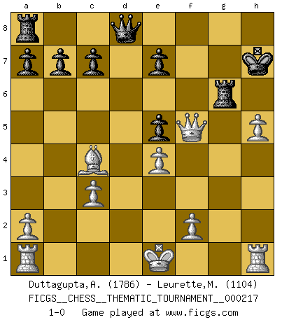 Last move : 1-0 2017 September 9 22:57:22 [Event "FICGS__CHESS__THEMATIC_TOURNAMENT__000217"] [Site "FICGS"] [Date "2017.06.05"] [Round "1"] [White "Duttagupta,Aniruddha"] [Black "Leurette,Marc-Antoine"] [Result "1-0"] [WhiteElo "1786"] [BlackElo "1104"] 1.d4 Nf6 2.c4 g6 3.Nc3 d5 4.cxd5 Nxd5 5.e4 Nxc3 6.bxc3 Bg7 7.Bg5 Nc6 8.Nf3 Bg4 9.h3 Bxf3 10.Qxf3 O-O 11.h4 h5 12.g4 f6 13.Be3 Ne5 14.dxe5 fxe5 15.Bc4+ Kh7 16.Qe2 Bh6 17.gxh5 gxh5 18.Qxh5 Rf6 19.Bxh6 Rxh6 20.Qf5+ Rg6 21.h5 1-0 King's Indian defense, 3.Nc3 Kingside Castling by player Black (move 10) Player White won this chess game. Follow this game move after move (download)If your opponent cannot do anything active, then don't rush the position; instead you should let him sit there, suffer, and beg you for a draw. (Jeremy Silman) Er war ein guter Schachspieler, aber ich kann Leute nicht ausstehen, die 'Heil Hitler' rufen (Über Alexander Aljechin). (Miguel Najdorf) El Ajedrez es 99 por ciento táctica. (Teichmann) Pour se monter efficace, un Cavalier a besoin d'avant-postes ! Les Cavaliers font les meilleurs bloqueurs de pions passés. Man with more than one clock never knows what time it is. (Chinese thought)