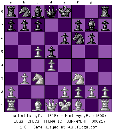 Last move : 1-0 2017 August 17 16:5:56 [Event "FICGS__CHESS__THEMATIC_TOURNAMENT__000217"] [Site "FICGS"] [Date "2017.06.05"] [Round "1"] [White "Laricchiuta,Claudio"] [Black "Machengo,Prosper"] [Result "1-0"] [WhiteElo "1318"] [BlackElo "1600"] 1.d4 Nf6 2.c4 g6 3.Nc3 d5 4.b3 Bg7 5.c5 e6 6.Nf3 1-0 This chess game has been lost on time (started : 2017.06.05 18:0:53) King's Indian defense, 3.Nc3 Player White won this chess game. Follow this game move after move (download)The beauty of a move lies not in its' appearance but in the thought behind it. (Siegbert Tarrasch) Wenn ich mich einlogge, glauben die Leute gewöhnlich nicht, dass ich es selbst bin und sie fangen an, mir dumme Fragen zu stellen. Und wenn sie es glauben, stellen sie wieder andere dumme Fragen. (Judith Polgar) El Ajedrez es de 30 a 40 por ciento psicología. Uno no cuenta con esto cuando se juega contra una computadora. No lo puedo confundir. (Judith Polgar) Le profane ne songe pas à la somme de jouissance dont il se prive, qui méconnaît ce jeu aux ressources aussi variées que passionnantes. (Jean-Marie Jeanton-Lamarche) Before all elsed, be armed. (Niccolo Machiavelli)