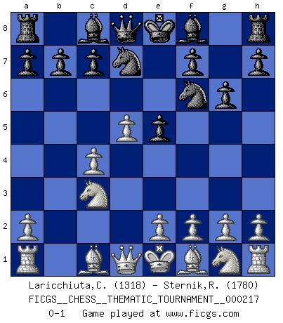 Last move : 0-1 2017 July 15 23:55:32 [Event "FICGS__CHESS__THEMATIC_TOURNAMENT__000217"] [Site "FICGS"] [Date "2017.06.05"] [Round "1"] [White "Laricchiuta,Claudio"] [Black "Sternik,Ryszard"] [Result "0-1"] [WhiteElo "1318"] [BlackElo "1780"] 1.d4 Nf6 2.c4 g6 3.Nc3 d5 4.b3 dxc4 5.bxc4 e5 6.d5 Nbd7 0-1 This chess game has been lost on time (started : 2017.06.05 18:0:53) King's Indian defense, 3.Nc3 Player Black won this chess game. Follow this game move after move (download)At this time Fischer is simply a level above all the best Chessplayers in the world. (John Jacobs) Kasparov ist eine Art Monster mit hundert Augen, denen auch nicht das Geringste entgeht. (Tony Miles) Cuando la partida de Ajedrez termina, el Peón y el Rey regresan a la misma caja. (Irish saying) L'ordinateur a tué l'originalité. Il n'y a plus guère d'aventures sur l'échiquier. (Jacob Murray) I can't decide which is riskier; taking crazy risks, or taking advice on crazy risks from a crazy risk taker. (Gregory House in House M.D.)