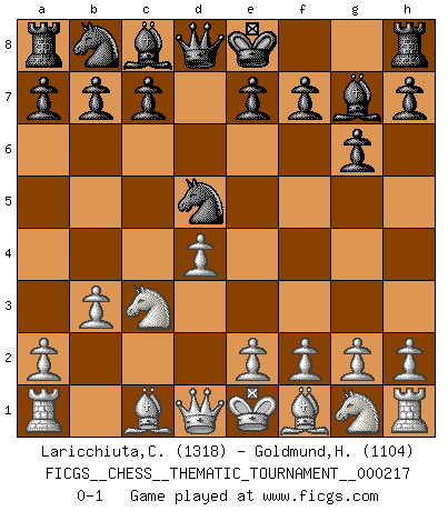 Last move : 0-1 2017 July 17 9:58:32 [Event "FICGS__CHESS__THEMATIC_TOURNAMENT__000217"] [Site "FICGS"] [Date "2017.06.05"] [Round "1"] [White "Laricchiuta,Claudio"] [Black "Goldmund,Heike"] [Result "0-1"] [WhiteElo "1318"] [BlackElo "1104"] 1.d4 Nf6 2.c4 g6 3.Nc3 d5 4.b3 Bg7 5.cxd5 Nxd5 0-1 This chess game has been lost on time (started : 2017.06.05 18:0:53) King's Indian defense, 3.Nc3 Player Black won this chess game. Follow this game move after move (download)Methodical thinking is of more use in Chess than inspiration. (C. J. S. Purdy) Schon mancher Spieler hat aufgegeben, um zu vermeiden, daß er eine Figur verliert. (Savielly Grigorievitsch Tartakower) El Ajedrez es tortura mental. (Garry Kasparov) 'L'échange des dames est un coup dur pour les deux adversaires...' Un journaliste lors d'une partie du match Spassky-Fischer The only difference between a tax man and a taxidermist is that the taxidermist leaves the skin. (Mark Twain)