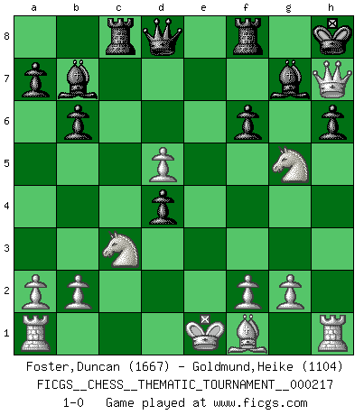 Last move : 1-0 2017 September 17 0:10:29 [Event "FICGS__CHESS__THEMATIC_TOURNAMENT__000217"] [Site "FICGS"] [Date "2017.06.05"] [Round "1"] [White "Foster,Duncan"] [Black "Goldmund,Heike"] [Result "1-0"] [WhiteElo "1667"] [BlackElo "1104"] 1.d4 Nf6 2.c4 g6 3.Nc3 d5 4.Nf3 Bg7 5.Bg5 O-O 6.Bxf6 Bxf6 7.cxd5 b6 8.e4 Nd7 9.e5 Bg7 10.h4 Bb7 11.h5 Rc8 12.Qd3 c5 13.hxg6 fxg6 14.Ng5 cxd4 15.Qh3 h6 16.Qe6+ Kh8 17.Qxg6 Nf6 18.exf6 exf6 19.Qh7+ 1-0 King's Indian defense, 3.Nc3 Kingside Castling by player Black (move 5) Player White won this chess game. Follow this game move after move (download)Chess is a part of culture and if a culture is declining then Chess too will decline. (Mikhail Botvinnik) Unter Putin wird alles Geld aus Russland wie von einem Staubsauger nach Moskau umgeleitet, das ist wie ein schwarzes Loch. (Garry Kasparov) Para mi, el Ajedrez es la vida y cada partida es como una nueva vida. Todo jugador de Ajedrez suele vivir muchas vidas durante su vida. (Eduard Gufeld) La vie est comme un jeu d'échecs : nous esquissons un plan, mais celui-ci est tributaire de ce que daignent faire l'adversaire aux échecs et le destin dans la vie. (Arthur Schopenhauer) Players are not good because they find tactics, it is about the way to find the positions in which those tactics are hidden. (Luc-Olivier Leclerc)