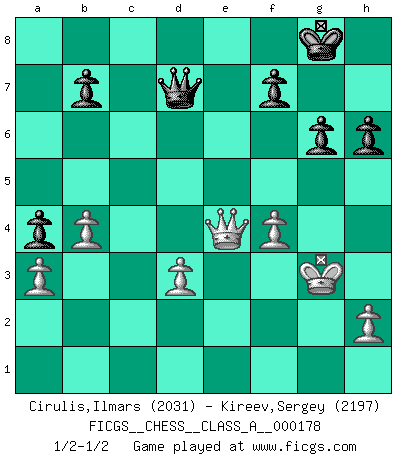 Last move : 1/2-1/2 2017 August 7 8:49:53 [Event "FICGS__CHESS__CLASS_A__000178"] [Site "FICGS"] [Date "2017.06.07"] [Round "1"] [White "Cirulis,Ilmars"] [Black "Kireev,Sergey"] [Result "1/2-1/2"] [WhiteElo "2031"] [BlackElo "2197"] 1.b4 e5 2.a3 d5 3.Bb2 Bd6 4.Nf3 Nd7 5.c4 dxc4 6.e3 Ngf6 7.Bxc4 a5 8.Nc3 O-O 9.Nb5 Nb6 10.Nxd6 cxd6 11.Bb3 a4 12.Ba2 Qe7 13.O-O Be6 14.Bxe6 Qxe6 15.Qe2 Rac8 16.Rfc1 Rxc1+ 17.Rxc1 Rc8 18.Rxc8+ Nxc8 19.e4 Nb6 20.d3 Qb3 21.g3 Ne8 22.Nh4 g6 23.f4 exf4 24.gxf4 Nc7 25.Nf3 Nb5 26.e5 Nd7 27.Kf2 dxe5 28.Nxe5 Nc3 29.Bxc3 Qxc3 30.Nxd7 Qd4+ 31.Kg3 Qxd7 32.Qe4 h6 1/2-1/2 Polish (Sokolsky) opening Kingside Castling by player Black (move 8) Kingside Castling by player White (move 13) This chess game ended in a draw. Follow this game move after move (download)I feel as if I were a piece in a game of Chess, when my opponent says of it: That piece cannot be moved. (Soren Kierkegaard) Kritik überlasse ich den Spießern. Ich zeige nichts, wofür ich mich schämen muss. (Alexandra Kosteniuk) Para mi, el Ajedrez es la vida y cada partida es como una nueva vida. Todo jugador de Ajedrez suele vivir muchas vidas durante su vida. (Eduard Gufeld) Je crois qu'il existe des manières très spécifiques de jouer efficacement contre une machine. Evidemment, nous n'avons aucune chance en technique pure, parce que l'ordinateur calcule de manière parfaite. Mais lorsque nous faisons appel à notre cerveau, en utilisant l'intuition et la compréhension, alors nous restons beaucoup plus forts. (Anatoli Karpov) Inventor: A person who makes an ingenious arrangement of wheels, levers and springs, and believes it civilization. (Ambrose Bierce, The Devil's Dictionary)