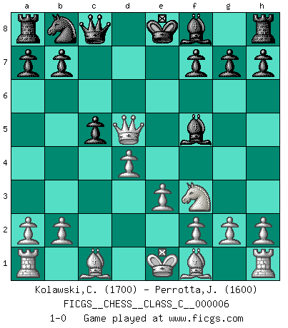 Last move : 1-0 2006 July 30 3:14:3 [Event "FICGS__CHESS__CLASS_C__000006"] [Site "FICGS"] [Date "2006.05.31"] [Round "1"] [White "Kolawski,Christof"] [Black "Perrotta,John Zach"] [Result "1-0"] [WhiteElo "1700"] [BlackElo "1600"] 1.d4 d5 2.Nf3 Nf6 3.e3 Bf5 4.c4 e6 5.Nc3 c5 6.Qb3 Qc8 7.cxd5 exd5 8.Nxd5 Nxd5 9.Qxd5 1-0 This chess game has been lost on time (started : 2006.05.31 8:2:36) Queen's pawn game Player White won this chess game. Follow this game move after move (download)I give 98 percent of my mental energy to Chess. Others give only 2 percent. (Bobby Fischer) Schach ist wie eine schöne Frau, zu der wir ständig zurückkehren, gleichviel, wie oft sie uns zurückweist. (Anonymous) La partida mas dura de ganar es una partida ganada. (Emanuel Lasker) Les Echecs mettent en conflit, non pas deux intelligences, mais deux volontés. (Lasker) Home computers are being called upon to perform many new functions, including the consumption of homework formerly eaten by the dog. (Doug Larson)