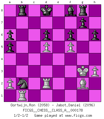 Last move : 1/2-1/2 2017 August 2 9:14:22 [Event "FICGS__CHESS__CLASS_A__000178"] [Site "FICGS"] [Date "2017.06.07"] [Round "1"] [White "Oortwijn,Ron"] [Black "Jabot,Daniel"] [Result "1/2-1/2"] [WhiteElo "2058"] [BlackElo "2096"] 1.e4 c5 2.Nf3 d6 3.d4 cxd4 4.Nxd4 Nf6 5.Nc3 a6 6.Be3 e6 7.g4 h6 8.Bg2 Nc6 9.h3 Ne5 10.f4 Nc4 11.Bc1 Qc7 12.Qe2 e5 13.Nf5 exf4 14.Bxf4 Nxb2 15.Nd5 Nxd5 16.exd5 Kd8 17.c4 Nxc4 18.Rc1 Qa5+ 19.Kf2 Ne5 20.Rhd1 Bxf5 21.gxf5 f6 22.Qb2 Rb8 23.Bd2 Nd3+ 24.Kg3 Nxb2 25.Bxa5+ b6 26.Rd2 bxa5 27.Rb1 Rg8 1/2-1/2 Sicilian : Najdorf, Byrne (English) attack This chess game ended in a draw. Follow this game move after move (download)You know, comrade Pachman, I don't enjoy being a Minister, I would rather play Chess like you. (Che Guevara) Schach ist ein Teil der Kultur, und wenn es mit der Kultur abwärts geht, geht es auch mit dem Schach abwärts. (Mikhail Moiseyevich Botvinik) El Ajedrez es un expediente tonto que hace creer a la gente inactiva que hacen una cosa muy astuta cuando solamente estan perdiendo su tiempo. (George Bernard Shaw) Le moment que je préfère le plus dans une rencontre, c'est celui où je sens que la personnalité de l'adversaire se brise. (Robert Fischer) May I never be complete. May I never be content. May I never be perfect. Deliver me, Tyler, from being perfect and complete. (Chuck Palahniuk, Fight Club)