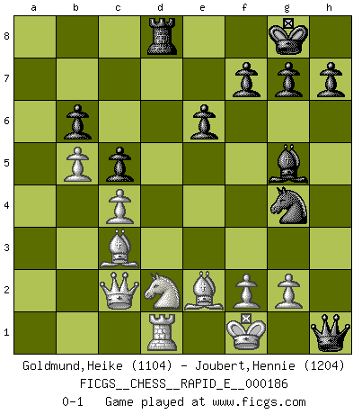 Last move : 0-1 2017 July 5 9:26:19 [Event "FICGS__CHESS__RAPID_E__000186"] [Site "FICGS"] [Date "2017.06.08"] [Round "1"] [White "Goldmund,Heike"] [Black "Joubert,Hennie"] [Result "0-1"] [WhiteElo "1104"] [BlackElo "1204"] 1.e4 c5 2.b4 e6 3.b5 d6 4.c4 Nf6 5.Bb2 Be7 6.d3 a6 7.a4 axb5 8.Nf3 Bd7 9.axb5 Rxa1 10.Bxa1 O-O 11.Be2 d5 12.Ne5 dxe4 13.Nxd7 Nbxd7 14.O-O exd3 15.Bxd3 Qc7 16.Nd2 Rd8 17.Qc2 b6 18.Rd1 Ne5 19.Bf1 Qd7 20.Bxe5 Ng4 21.Bb2 Bg5 22.Bc3 Qd6 23.Be2 Qxh2+ 24.Kf1 Qh1+ 0-1 Sicilian : wing gambit Kingside Castling by player Black (move 10) Kingside Castling by player White (move 14) Player Black won this chess game. Follow this game move after move (download)Chess is a forcing house where the fruits of character can ripen more fully than in life. (Edward Morgan Foster) Über Kasparov: Es ist offensichtlich, daß er in einem totalitären Staat aufwuchs und deshalb zu diktatorischen Zügen neigt. (Viktor Kortschnoi) ¿Porque tengo que perder ante este idiota?. (Aron Nimzovich) Il n'y a pas de prix trop élevé au scalp de l'ennemi. (Koblentz) The Internet is the first thing that humanity has build that humanity doesn't understand, the largest experiment in anarchy that we have ever had. (Eric Schmidt)