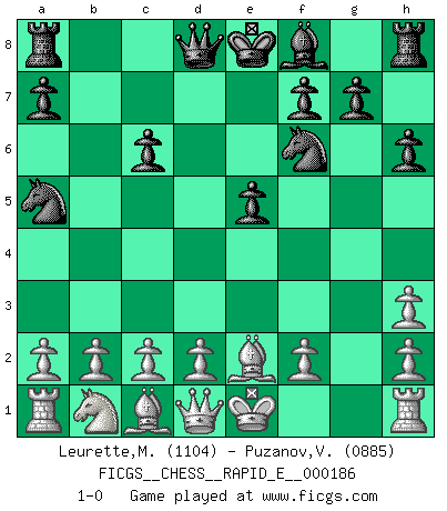 Last move : 1-0 2017 July 23 13:8:44 [Event "FICGS__CHESS__RAPID_E__000186"] [Site "FICGS"] [Date "2017.06.08"] [Round "1"] [White "Leurette,Marc-Antoine"] [Black "Puzanov,Vasyl"] [Result "1-0"] [WhiteElo "1104"] [BlackElo "0885"] 1.e4 e5 2.Nf3 Nc6 3.Bc4 Nf6 4.Ng5 d5 5.exd5 Na5 6.Bb5+ c6 7.dxc6 bxc6 8.Be2 h6 9.Nh3 Bxh3 10.gxh3 1-0 Two knights defense Player White won this chess game. Follow this game move after move (download)Becoming successful at Chess allows you to discover your own personality. That's what I want for the kids I teach. (Saudin Robovic) Kleine Schachspieler machen Mist, und große Schachspieler machen Mist, aber große machen weniger Mist. (Fritz Sämisch) No nos podemos resistir a la fascinación de un sacrificio ya que la pasión por los sacrificios es parte de la naturaleza de un jugador de Ajedrez. (Rudolf Spielman) Botvinnik disait en comparant les échecs à la musique: Il existe une science dont le but est l'étude de l'acoustique et des sons. Mais il y a aussi un art qui se sert de l'océan des sons : c'est la musique. De toute évidence, il en est de même pour la pensée. La logique est l'étude des lois de la réflexion et les échecs reflètent, en tant qu'art, le côté logique de la réflexion, sous la forme d'images artistiques... Extrait de Fischer - Spassky, Reykjavik 1972 par Alexander & F. Wyndham (Ed. Solar), p 37. The hypothalamus is one of the most important parts of the brain, involved in many kinds of motivation, among other functions. The hypothalamus controls the 'Four Fs: Fighting, Fleeing, Feeding and Mating. (Unknown author)