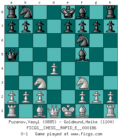 Last move : 0-1 2017 July 14 15:34:21 [Event "FICGS__CHESS__RAPID_E__000186"] [Site "FICGS"] [Date "2017.06.08"] [Round "1"] [White "Puzanov,Vasyl"] [Black "Goldmund,Heike"] [Result "0-1"] [WhiteElo "0885"] [BlackElo "1104"] 1.e4 d5 2.exd5 Qxd5 3.Nc3 Qa5 4.d4 Nf6 5.Nf3 Bf5 0-1 Scandinavian defense Player Black won this chess game. Follow this game move after move (download)No Chess Grandmaster is normal; they only differ in the extent of their madness. (Viktor Korchnoi) Kostenjuk hat keinen Sexappeal. (Loek van Wely) Bobby Fischer es el jugador de Ajedrez mas grande que jamás haya existido. (Ken Smith) Vouloir jouer aux échecs contre soi-même est aussi paradoxal que vouloir marcher sur son ombre. (Stefan Zweig) Happy endings are just stories that haven't finished yet. (Jane Smith in Mr & Mrs Smith)