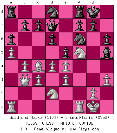 Last move : 1-0 2017 August 18 4:7:41 [Event "FICGS__CHESS__RAPID_E__000186"] [Site "FICGS"] [Date "2017.06.08"] [Round "1"] [White "Goldmund,Heike"] [Black "Bromo,Alexis"] [Result "1-0"] [WhiteElo "1104"] [BlackElo "0958"] 1.e4 e5 2.Nf3 Nc6 3.Bc4 h6 4.O-O Bc5 5.c3 Nf6 6.b4 Bb6 7.d3 d6 8.a4 a6 9.a5 Ba7 10.Be3 Bxe3 11.fxe3 Bg4 12.Nbd2 Qe7 13.h3 Bh5 14.Qb3 O-O 15.Nh4 Nd8 16.Nf5 Qd7 17.d4 1-0 This chess game has been lost on time (started : 2017.06.08 7:24:55) King's pawn game Kingside Castling by player White (move 4) Kingside Castling by player Black (move 14) Player White won this chess game. Follow this game move after move (download)No other master has such a terrific will to win. At the board he radiates danger, and even the strongest opponents tend to freeze, like rabbits when they smell a panther. Even his weaknesses are dangerous. As white, his opening game is predictable - you can make plans against it - but so strong that your plans almost never work. In the middle game his precision and invention are fabulous, and in the end game you simply cannot beat him. (Anonymous German Expert) Frage des Reporters: -Welche besonderen Umstände rechtfertigen das Anhalten der Uhren während einer Turnierpartie? Antwort: -Einen Fotographen zu strangulieren. (Siegbert Tarrasch) Un Peón pasado aumenta su poder a medida de que el número de piezas en el tablero disminuye. (Capablanca) Comme les marins qui ont mille raisons différentes d'aller en mer, les joueurs d'échecs en ont tout autant avant de s'installer devant une table et jouer... (Vincent Bertignac, philosophe) Good decisions come from experience, and experience comes from bad decisions. (Anonymous)