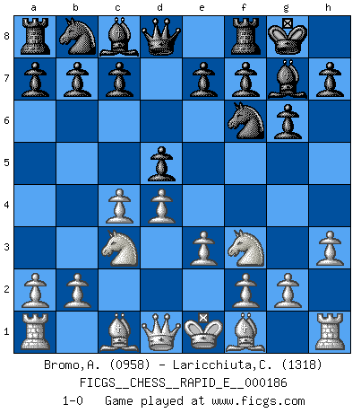 Last move : 1-0 2017 August 2 1:3:30 [Event "FICGS__CHESS__RAPID_E__000186"] [Site "FICGS"] [Date "2017.06.08"] [Round "1"] [White "Bromo,Alexis"] [Black "Laricchiuta,Claudio"] [Result "1-0"] [WhiteElo "0958"] [BlackElo "1318"] 1.d4 Nf6 2.c4 g6 3.Nc3 Bg7 4.e3 O-O 5.Nf3 d5 6.h3 1-0 This chess game has been lost on time (started : 2017.06.08 7:24:55) King's Indian defense, 3.Nc3 Kingside Castling by player Black (move 4) Player White won this chess game. Follow this game move after move (download)It's always better to sacrifice your opponent's men. (Savielly Tartakover) Wer wird heute Abend ihr Gegner sein? -- Heute Abend spiele ich gegen die schwarzen Steine. (Akiba Rubinstein) Muchos se han convertido en Maestros de Ajedrez, nadie se ha convertido en el Maestro del Ajedrez. (Siegbert Tarrasch) Horreur, mais aussi harmonie suprême : qu'y avait-il en effet au monde en dehors des échecs ? Le brouillard, l'inconnu, le non-être... (Vladimir Nabokov) Once you start thinking you have nothing left to learn, you have everything to learn. (Steve Badget)