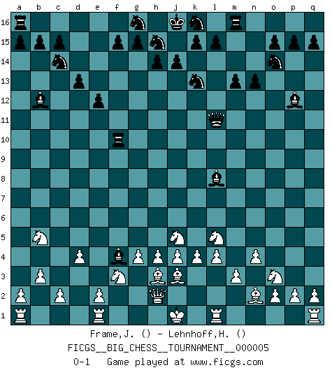 Last move : 0-1 2007 May 1 1:35:7 [Event "FICGS__BIG_CHESS__TOURNAMENT__000005"] [Site "FICGS"] [Date "2007.04.08"] [Round "1"] [White "Frame,Jeremy"] [Black "Lehnhoff,Heinz-Georg"] [Result "0-1"] [WhiteElo ""] [BlackElo ""] 1.j3-j4 j15-k13 2.h3-h4 m15-m13 3.k2-k4 n15-n13 4.g2-g4 p16-o14 5.j2-l3 o16-j11 6.f2-f4 b16-c14 7.h2-f3 l16-p12 8.k1-h2 e15-e13 9.m2-m3 d15-d13 10.l1-j3 f16-b12 11.p1-o3 m16-m14 12.n2-n4 h16-n11 13.g1-h3 m14-l14 14.o1-n2 l14-l3 15.h1-j2 n11-l11 16.m1-l1 q16-m16 17.h2-k3 c16-n6 18.h3-j5 l3-l10 19.l2-l4 e13-e12 20.f1-h3 e16-e13 21.b1-c3 e13-f13 22.k3-l5 n6-l8 23.b2-b3 f13-f4 24.j2-h2 j11-d6 25.c3-b5 d6-b8 26.d2-d4 l10-f10 27.c1-f4 b8-f4 0-1 Follow this game move after move (download)No other master has such a terrific will to win. At the board he radiates danger, and even the strongest opponents tend to freeze, like rabbits when they smell a panther. Even his weaknesses are dangerous. As white, his opening game is predictable - you can make plans against it - but so strong that your plans almost never work. In the middle game his precision and invention are fabulous, and in the end game you simply cannot beat him. (Anonymous German Expert) Frage des Reporters: -Worin besteht das Ziel von Gambiteröffnungen? Antwort: -Auf Kosten der Partie einen Ruf als Angriffspieler zu erwerben.- (Siegbert Tarrasch) Prefiero perder una partida realmente buena, que ganar una mala. (David Levy) Toutes choses étant égales, c'est la conviction qui gagne. Alliée à une volonté de vaincre, elle sert de détonateur, suscite des idées, disperse les doutes et aide à penser clairement. (Robert Fischer) Perseverance does not equal worthiness. Next time you want to get my attention, wear something fun. Low-riding jeans are hot. (Gregory House, House M.D.)