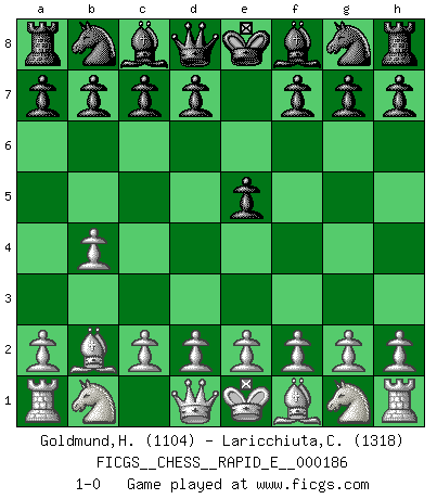 Last move : 1-0 2017 July 10 23:23:42 [Event "FICGS__CHESS__RAPID_E__000186"] [Site "FICGS"] [Date "2017.06.08"] [Round "1"] [White "Goldmund,Heike"] [Black "Laricchiuta,Claudio"] [Result "1-0"] [WhiteElo "1104"] [BlackElo "1318"] 1.b4 e5 2.Bb2 1-0 This chess game has been lost on time (started : 2017.06.08 7:24:55) Polish (Sokolsky) opening Player White won this chess game. Follow this game move after move (download)Chess is a fairy tale of 1001 blunders. (Savielly Tartakower) Im Reiche der Wirklichkeit ist man nie so glücklich wie im Reiche der Gedanken. (Arthur Schopenhauer) El Ajedrez es tan interesante por sí solo, que no es necesario un interés monetario para persuadir a una persona a que lo practique; por lo tanto, nunca se juega por dinero. (Benjamin Franklin) Le thème de l'attaque double intervient d'une manière ou d'une autre dans l'immense majorité des combinaisons. (Youri Averbakh) There are 10 types of people in this world: those who understand binary and those who don't. (Anonymous)