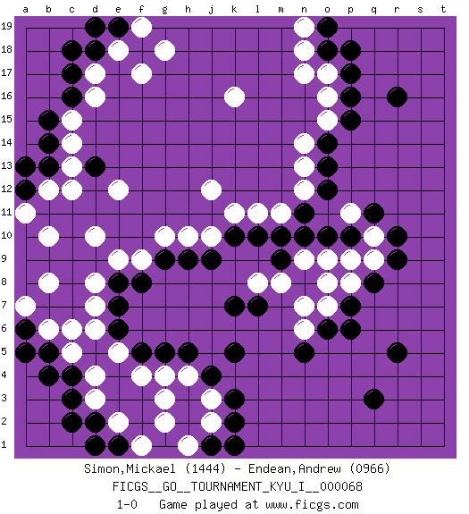Last move : 1-0 2017 October 18 23:22:26 [Event "FICGS__GO__TOURNAMENT_KYU_I__000068"] [Site "FICGS"] [Date "2017.06.08"] [Round "1"] [Black "Simon,Mickael"] [White "Endean,Andrew"] [Result "1-0"] [Rating 1 "1444"] [Rating 2 "0966"] 1.r16 d16 2.q3 d4 3.p17 k16 4.r5 d10 5.k3 g3 6.k5 n17 7.r10 f17 8.k10 j12 9.g5 c6 10.d13 c12 11.o14 o15 12.p15 o16 13.p16 n14 14.o13 n13 15.o12 n12 16.n11 m11 17.m10 l11 18.l10 k11 19.c17 d17 20.c16 c15 21.b15 c14 22.b14 c13 23.b13 b12 24.d18 e18 25.c18 j10 26.j9 h10 27.h9 g10 28.g9 f9 29.f8 e9 30.e8 d8 31.a12 a11 32.a13 b10 33.c3 d3 34.c4 c5 35.d2 e2 36.b5 b6 37.b4 e5 38.c2 f4 39.o18 n18 40.a6 a7 41.a5 b8 42.e6 d6 43.e7 d7 44.n10 o17 45.p18 n19 46.f5 g4 47.h5 h4 48.j4 o9 49.p7 n7 50.o6 n6 51.n5 o7 52.p6 p8 53.q8 q9 54.r9 q10 55.q11 p11 56.p10 p9 57.o10 n9 58.n8 m8 59.m9 o8 60.l7 j2 61.k2 j3 62.j1 h1 63.k1 g2 64.e1 f1 65.d1 e12 66.e19 f19 67.d19 g18 68.o19 l8 69.k7 1-0 Here are the names of the openings (joseki) played in the four corners : Player Black won this Go (weiqi, baduk) game. Follow this game move after move (download)You have to like to win, and to learn to recognize the errors that gave you the victory. (Pierre Audouard) The modern world has divided itself into Conservatives and Progressives. The business of Progressives is to go on making mistakes. The business of the Conservatives is to prevent the mistakes from being corrected. (G.K. Chesterton)