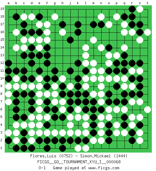 Last move : 0-1 2017 October 12 15:54:14 [Event "FICGS__GO__TOURNAMENT_KYU_I__000068"] [Site "FICGS"] [Date "2017.06.08"] [Round "1"] [Black "Flores,Luis"] [White "Simon,Mickael"] [Result "0-1"] [Rating 1 "0752"] [Rating 2 "1444"] 1.d10 q3 2.q4 q16 3.d16 d4 4.k4 f17 5.k16 f15 6.f13 d18 7.c17 c18 8.c16 h16 9.j15 e14 10.f14 e15 11.e13 c14 12.c13 b14 13.d14 d15 14.d13 c15 15.e16 f16 16.h17 c6 17.c8 e3 18.r10 r4 19.q5 r5 20.r6 p3 21.r3 s3 22.r2 s2 23.s4 s5 24.e18 e17 25.k17 q6 26.q7 p6 27.p7 o6 28.o7 n7 29.n6 p4 30.m7 n8 31.m6 m8 32.l8 l9 33.k8 o10 34.o8 n10 35.r12 r7 36.r8 s7 37.n12 k11 38.k10 l10 39.m9 n9 40.k9 m12 41.l11 m10 42.k12 l12 43.j11 m11 44.n13 q9 45.r17 q17 46.q18 p18 47.r18 r16 48.s16 s15 49.s17 o17 50.q8 r9 51.p9 p10 52.s9 q10 53.s6 t6 54.s8 r11 55.s10 s11 56.q11 q12 57.p11 o12 58.p12 p13 59.q13 o13 60.o11 n11 61.q12 n14 62.m13 q14 63.s12 l14 64.c3 h3 65.b18 b16 66.g2 g3 67.d6 c7 68.c5 d5 69.m14 m15 70.o14 l13 71.d7 c4 72.b5 b4 73.b7 h6 74.f2 f3 75.e2 d2 76.h2 j3 77.j2 k3 78.c2 d3 79.d1 b2 80.b1 b3 81.k2 l3 82.l2 m2 83.m3 n2 84.m4 l4 85.k5 l5 86.h5 k6 87.j6 j5 88.j7 j4 89.g5 e6 90.f6 e7 91.d8 e8 92.e5 g7 93.m5 l7 94.l6 k5 95.k7 g8 96.g6 h7 97.f9 e9 98.a2 a3 99.c1 e1 100.f1 l1 101.o2 n3 102.o3 n4 103.o4 n5 104.l7 o5 105.f7 f8 106.h9 g9 107.f10 e10 108.e11 f11 109.g10 h10 110.g11 d11 111.h1 k1 112.f12 d9 113.c10 c9 114.b8 b10 115.c11 b9 116.b11 f5 117.f4 a11 118.a12 a8 119.h8 j9 120.j8 a7 121.b6 e4 122.a9 f5 123.a10 a11 124.a10 e5 125.a11 a9 126.d12 s19 127.r19 t16 128.n17 n18 129.m17 g18 0-1 Here are the names of the openings (joseki) played in the four corners : Corner q4 : q3 q4 Komoku (Somok, Xiao~mu`) 3-4 Point. The komoku (3-4) point is the traditional corner enclosure move.. Corner d16 : d16 f17 Hoshi (Hwajeom, Seongjeom, Xingwei`) 4-4 Point. The star or hoshi (4-4) point, emphasizing influence at the potential expense of territory. Ikken Kakari (Hankan Keolch'im, Yi Gua`jiao~, 1-Space Low Approach). White 2 is the standard approach move to the 4-4. Corner q16 : q16 r12 Hoshi (Hwajeom, Seongjeom, Xingwei`) 4-4 Point. The star or hoshi (4-4) point, emphasizing influence at the potential expense of territory. Player White won this Go (weiqi, baduk) game. Follow this game move after move (download)There are players who don't accept exchange: they play many moves that perpetuate a previous state of the game. (Pierre Audouard) The faster the computer, the slower the brain. (Thibault de Vassal)