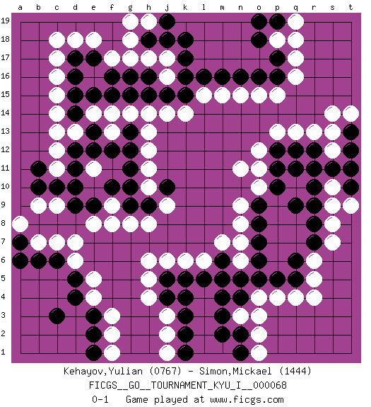 Last move : 0-1 2017 October 30 21:9:20 [Event "FICGS__GO__TOURNAMENT_KYU_I__000068"] [Site "FICGS"] [Date "2017.06.08"] [Round "1"] [Black "Kehayov,Yulian"] [White "Simon,Mickael"] [Result "0-1"] [Rating 1 "0767"] [Rating 2 "1444"] 1.c3 q16 2.d16 q4 3.d10 e4 4.k4 f17 5.p17 q17 6.p16 p15 7.o16 o15 8.n16 d18 9.d5 e5 10.d4 h4 11.k3 h6 12.q9 r6 13.q11 r13 14.r11 j17 15.k16 c17 16.d15 k6 17.m4 d6 18.c6 d7 19.e3 f3 20.e2 c7 21.b6 b7 22.a6 c14 23.d14 c12 24.d12 d13 25.e13 c13 26.d11 e14 27.f15 f13 28.e12 f14 29.e15 h14 30.g15 h12 31.h15 j14 32.j15 k14 33.k15 c16 34.k17 o3 35.m3 s9 36.r8 s8 37.r7 s7 38.q6 r5 39.q5 r4 40.o5 n7 41.o7 n8 42.o8 n9 43.o9 n11 44.p11 n15 45.m16 m15 46.g11 f9 47.d9 e8 48.b11 c11 49.c10 b9 50.b10 c9 51.g9 g8 52.h9 h8 53.f10 j9 54.j10 h10 55.g10 h11 56.e9 f8 57.f12 e11 58.s11 f2 59.e1 f1 60.n2 o2 61.n1 c15 62.j18 h17 63.h18 g18 64.k18 p18 65.o18 q18 66.o19 l15 67.l16 n6 68.n5 o1 69.o6 n3 70.m2 s13 71.r9 o12 72.p12 p13 73.g12 h13 74.g13 g14 75.a7 a8 76.g16 g17 77.d17 c18 78.e17 e18 79.f16 p4 80.p5 s10 81.r10 o10 82.p10 o11 83.q12 q13 84.t11 j2 85.k2 j3 86.k1 j1 87.m5 l6 88.j4 h5 89.j5 j6 90.m6 m7 91.l5 h19 92.j19 g19 93.t13 t14 94.t12 s14 95.t10 t9 96.p19 q19 97.k5 o4 98.n4 s12 99.r12 j16 100.h16 pass 0-1 Here are the names of the openings (joseki) played in the four corners : Corner d4 : c3 e4 San-San (Sam-Sam, San-San) 3-3 Point. The San-San (3-3) point, emphasizing territory at the expense of influence. Ikken Takagakari (Hankan Nop'dakeolch'im, Yi Gaokeolch'im, 1-Space High Approach). White 2 is a high tight attack with a direction bias. White continues with 4-5. Tactically, any other response is less advantageous. Corner d16 : d16 f17 Hoshi (Hwajeom, Seongjeom, Xingwei`) 4-4 Point. The star or hoshi (4-4) point, emphasizing influence at the potential expense of territory. Ikken Kakari (Hankan Keolch'im, Yi Gua`jiao~, 1-Space Low Approach). White 2 is the standard approach move to the 4-4. Corner q16 : q16 p17 Hoshi (Hwajeom, Seongjeom, Xingwei`) 4-4 Point. The star or hoshi (4-4) point, emphasizing influence at the potential expense of territory. Corner q4 : q4 q9 Hoshi (Hwajeom, Seongjeom, Xingwei`) 4-4 Point. The star or hoshi (4-4) point, emphasizing influence at the potential expense of territory. Player White won this Go (weiqi, baduk) game. Follow this game move after move (download)Conservative and slow will win. Believe it ! (Anonymous) All battles are fought by scared men who'd rather be someplace else. (John Wayne in the movie In harm's way)