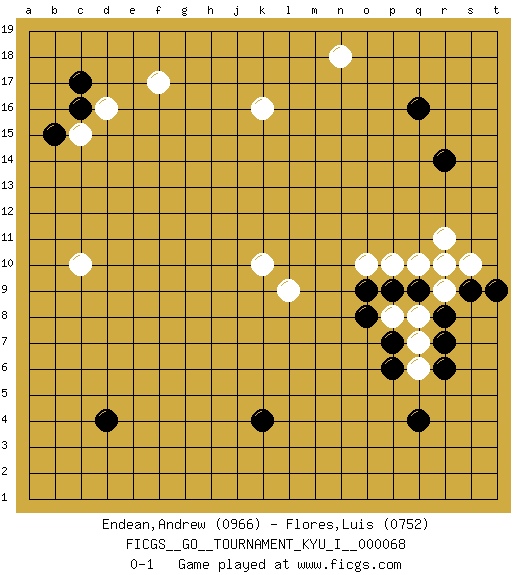 Last move : 0-1 2017 August 7 20:53:3 [Event "FICGS__GO__TOURNAMENT_KYU_I__000068"] [Site "FICGS"] [Date "2017.06.08"] [Round "1"] [Black "Endean,Andrew"] [White "Flores,Luis"] [Result "0-1"] [Rating 1 "0966"] [Rating 2 "0752"] 1.q4 c10 2.q16 d16 3.d4 q10 4.k4 k16 5.r14 k10 6.r8 q7 7.r7 r9 8.s9 s10 9.t9 r11 10.q9 r10 11.p9 q8 12.r6 p8 13.o9 p10 14.o8 o10 15.p7 q6 16.p6 l9 17.c17 f17 18.c16 c15 19.b15 n18 0-1 Here are the names of the openings (joseki) played in the four corners : Corner d16 : d16 c17 Hoshi (Hwajeom, Seongjeom, Xingwei`) 4-4 Point. The star or hoshi (4-4) point, emphasizing influence at the potential expense of territory. Player White won this Go (weiqi, baduk) game. Follow this game move after move (download)If a formation is symmetrical, play at the center. (Anonymous) Computers make it easier to do a lot of things, but most of the things they make it easier to do don't need to be done. (Andy Rooney)