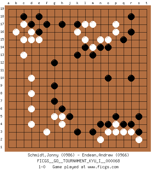 Last move : 1-0 2017 September 15 20:12:23 [Event "FICGS__GO__TOURNAMENT_KYU_I__000068 "] [Site "FICGS"] [Date "2017.06.08"] [Round "1"] [Black "Schmidt,Jonny "] [White "Endean,Andrew "] [Result "1-0"] [Rating 1 "0986"] [Rating 2 "0966"] 1.q4 d16 2.r16 d4 3.f17 c13 4.k3 f3 5.h17 k16 6.g9 d10 7.g12 p17 8.r10 m17 9.k13 d6 10.n14 r3 11.r4 q3 12.o4 o3 13.n4 p4 14.p5 p3 15.g7 d8 16.m3 n2 17.k17 l17 18.s3 s2 19.d17 c17 20.c16 c15 21.e16 d15 22.c18 b16 23.q15 o15 24.o14 n15 25.s5 h4 26.j5 h5 27.h6 g5 28.l14 l15 29.e18 e15 30.r18 p16 31.o10 m14 32.m13 1-0 This go game has been lost on time (started : 2017.06.08 7:36:31) Here are the names of the openings (joseki) played in the four corners : Corner d16 : d16 f17Hoshi (Hwajeom, Seongjeom, Xingwei`) 4-4 Point. The star or hoshi (4-4) point, emphasizing influence at the potential expense of territory.Ikken Kakari (Hankan Keolch'im, Yi Gua`jiao~, 1-Space Low Approach). Black 2 is the standard approach move to the 4-4. Corner q16 : r16 p17Komoku (Somok, Xiao~mu`) 3-4 Point. The komoku (3-4) point is the traditional corner enclosure move..Ikken Kakari (Hankan Keolch'im, Yi Gua`jiao~, 1-Space Low Pincer). The small knight move is the basic approach move to the 3-4 point stone. It has been continually used for over four centuries. There are limitless variations, with new moves constantly being discovered. White 2 opens the door to a treaure store of joseki. Corner q4 : q4 r3Hoshi (Hwajeom, Seongjeom, Xingwei`) 4-4 Point. The star or hoshi (4-4) point, emphasizing influence at the potential expense of territory. Player Black won this Go (weiqi, baduk) game.Follow this game move after move (download ) Only amateurs try to come up with fancy moves. (Anonymous) Begin at the beginning and go on till you come to the end; then stop. (Lewis Carrol, Alice in Wonderland)