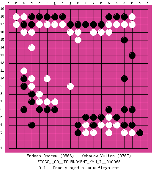 Last move : 0-1 2017 October 8 9:35:28 [Event "FICGS__GO__TOURNAMENT_KYU_I__000068"] [Site "FICGS"] [Date "2017.06.08"] [Round "1"] [Black "Endean,Andrew"] [White "Kehayov,Yulian"] [Result "0-1"] [Rating 1 "0966"] [Rating 2 "0767"] 1.q4 r17 2.d4 d16 3.k4 k15 4.q10 d10 5.c6 f10 6.q15 o17 7.r13 d14 8.c17 b18 9.d17 e17 10.e18 f17 11.f18 g17 12.g18 h17 13.h18 c18 14.d18 b17 15.j17 j16 16.k17 k16 17.l17 m16 18.m17 n16 19.n17 o16 20.o18 p17 21.p18 q17 22.q18 r18 23.r6 l3 24.k3 l4 25.l5 n4 26.m4 m3 27.m5 o3 28.n5 o5 29.o6 p4 30.p5 o4 31.q6 q3 32.r4 r3 33.s3 c16 34.c9 d9 35.c10 c11 36.d8 e8 37.d7 e7 38.e6 f7 39.f6 g7 40.g6 j9 0-1 Here are the names of the openings (joseki) played in the four corners : Corner q16 : r17 q15 San-San (Sam-Sam, San-San) 3-3 Point. The San-San (3-3) point, emphasizing territory at the expense of influence. Ikken Takagakari (Hankan Nop'dakeolch'im, Yi Gaokeolch'im, 1-Space High Approach). Black 2 is a high tight attack with a direction bias. Black continues with 4-5. Tactically, any other response is less advantageous. Player White won this Go (weiqi, baduk) game. Follow this game move after move (download)Win the stones, lose the game. (Anonymous) As a goal marker shodan is important. As a destination it is a poor place to stop. (Thomas Tamayo)