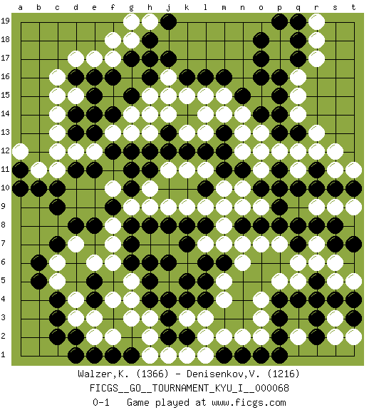Last move : 0-1 2017 July 12 1:28:12 [Event "FICGS__GO__TOURNAMENT_KYU_I__000068"] [Site "FICGS"] [Date "2017.06.08"] [Round "1"] [Black "Walzer,Karel"] [White "Denisenkov,Valentin"] [Result "0-1"] [Rating 1 "1366"] [Rating 2 "1216"] 1.c4 q16 2.q4 r6 3.d16 e3 4.e4 f4 5.e5 d3 6.c3 g3 7.c7 o3 8.p3 o4 9.r5 q6 10.r2 f17 11.h17 d17 12.e16 e17 13.f16 c16 14.g17 c14 15.o17 q14 16.l16 c11 17.q10 r12 18.r11 q12 19.k4 l3 20.l4 k3 21.h5 g5 22.j3 j4 23.h4 h3 24.j2 j5 25.j6 g4 26.h6 f6 27.c9 d15 28.f14 m4 29.l5 m5 30.l6 n7 31.o10 m9 32.n11 n13 33.l10 m10 34.m11 l11 35.l12 k11 36.m13 m14 37.k12 j11 38.l8 l9 39.d11 d12 40.e11 l14 41.k14 l13 42.m12 k13 43.j12 k15 44.k16 j14 45.j8 j9 46.g8 m8 47.c2 h2 48.f1 j1 49.k2 l2 50.k5 k1 51.j4 f2 52.e1 e2 53.g1 h1 54.d1 e6 55.e8 c6 56.b6 c5 57.b5 d4 58.h11 h10 59.g11 p18 60.o18 p17 61.o16 j16 62.j17 h13 63.h12 f13 64.e14 g14 65.g15 h15 66.h16 j15 67.o14 n14 68.p15 q15 69.r8 s5 70.s4 q5 71.r4 s6 72.s7 s11 73.s10 q11 74.r10 s12 75.p8 r7 76.s8 p7 77.o8 o7 78.m6 n6 79.k8 k9 80.c10 b11 81.b10 e12 82.g10 h9 83.h8 g9 84.f9 d7 85.d8 s3 86.t3 q2 87.p2 s2 88.r3 t2 89.t4 t5 90.p4 p5 91.m1 o2 92.o1 n2 93.n1 m2 94.n15 m15 95.m16 o13 96.d13 c13 97.e15 g18 98.h18 f18 99.n8 m7 100.p11 n9 101.f12 g13 102.e13 c12 103.d14 c15 104.j13 l15 105.g12 h14 106.p13 p12 107.p14 o12 108.q13 r13 109.p16 o9 110.p9 o11 111.p10 n10 112.q17 r17 113.q18 r18 114.q19 r19 115.p19 t9 116.t10 s9 117.q8 r9 118.t7 t11 119.g6 l7 120.k7 f7 121.g7 f8 122.a11 a12 123.a10 h19 124.j19 g19 125.d2 l1 126.p1 n12 127.q7 f10 0-1 Here are the names of the openings (joseki) played in the four corners : Corner q4 : q4 r6 Hoshi (Hwajeom, Seongjeom, Xingwei`) 4-4 Point. The star or hoshi (4-4) point, emphasizing influence at the potential expense of territory. Ikken Kakari (Hankan Keolch'im, Yi Gua`jiao~, 1-Space Low Approach). White 2 is the standard approach move to the 4-4. Corner d4 : c4 e3 Komoku (Somok, Xiao~mu`) 3-4 Point. The komoku (3-4) point is the traditional corner enclosure move.. Ikken Kakari (Hankan Keolch'im, Yi Gua`jiao~, 1-Space Low Pincer). The small knight move is the basic approach move to the 3-4 point stone. It has been continually used for over four centuries. There are limitless variations, with new moves constantly being discovered. White 2 opens the door to a treaure store of joseki. Corner d16 : d16 f17 Hoshi (Hwajeom, Seongjeom, Xingwei`) 4-4 Point. The star or hoshi (4-4) point, emphasizing influence at the potential expense of territory. Ikken Kakari (Hankan Keolch'im, Yi Gua`jiao~, 1-Space Low Approach). White 2 is the standard approach move to the 4-4. Corner q16 : q16 o17 Hoshi (Hwajeom, Seongjeom, Xingwei`) 4-4 Point. The star or hoshi (4-4) point, emphasizing influence at the potential expense of territory. Ikken Kakari (Hankan Keolch'im, Yi Gua`jiao~, 1-Space Low Approach). Black 2 is the standard approach move to the 4-4. Player White won this Go (weiqi, baduk) game. Follow this game move after move (download)Never try to cut bamboo joints. (Anonymous) You think that education is too expensive ? Try ignorance. (Derek Bok)