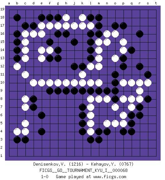 Last move : 1-0 2017 October 18 23:26:34 [Event "FICGS__GO__TOURNAMENT_KYU_I__000068"] [Site "FICGS"] [Date "2017.06.08"] [Round "1"] [Black "Denisenkov,Valentin"] [White "Kehayov,Yulian"] [Result "1-0"] [Rating 1 "1216"] [Rating 2 "0767"] 1.r16 c4 2.q4 d16 3.p17 c11 4.e4 j17 5.c3 c5 6.e6 d10 7.c17 c16 8.d17 e17 9.e18 f17 10.f18 g17 11.b16 c15 12.b15 c14 13.b18 q10 14.k4 l4 15.l3 l5 16.m3 p5 17.p4 o5 18.q5 p6 19.r7 q7 20.r6 q8 21.r12 r8 22.m17 p15 23.k5 l6 24.d8 c8 25.d7 c7 26.k6 l7 27.p12 n15 28.l15 m14 29.l14 m13 30.l13 m12 31.f15 f14 32.g14 e16 33.f13 e14 34.g13 e13 35.o10 m10 36.m9 l10 37.l9 k10 38.k9 j10 39.j9 h10 40.h9 g10 41.g9 f10 42.q6 n8 43.n4 n5 44.o8 o7 45.n9 m8 46.j15 k17 47.l16 l12 48.k12 k11 49.j12 p8 50.o9 p10 51.o11 r10 52.b3 b4 53.q14 p14 54.p13 o13 55.b14 c13 56.b13 b12 57.l18 k18 58.k7 l8 59.f9 e10 60.g18 h18 61.h16 h17 62.g16 l17 63.m18 o16 64.o17 n16 65.m16 m15 66.s11 s10 67.s8 r9 68.m4 1-0 This go game has been lost on time (started : 2017.06.08 7:36:31) Here are the names of the openings (joseki) played in the four corners : Corner d4 : c4 e4 Komoku (Somok, Xiao~mu`) 3-4 Point. The komoku (3-4) point is the traditional corner enclosure move.. Ikken Takagakari (Hankan Nop'dakeolch'im, Yi Gaogua`jiao~, 1-Space High Approach). The 5-4 approach move has become more popular in modern times, as modern Go emphasizes speed and influence. Corner q4 : q4 l4 Hoshi (Hwajeom, Seongjeom, Xingwei`) 4-4 Point. The star or hoshi (4-4) point, emphasizing influence at the potential expense of territory. Player Black won this Go (weiqi, baduk) game. Follow this game move after move (download)Win the stones, lose the game. (Anonymous) The mind is like a parachute, it only functions when its open. (Unknown)