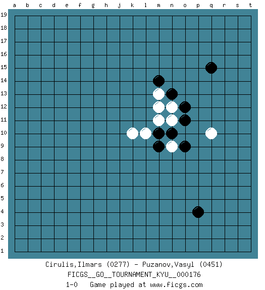 Last move : 1-0 2017 August 3 13:16:8 [Event "FICGS__GO__TOURNAMENT_KYU__000176"] [Site "FICGS"] [Date "2017.06.10"] [Round "1"] [Black "Cirulis,Ilmars"] [White "Puzanov,Vasyl"] [Result "1-0"] [Rating 1 "0277"] [Rating 2 "0451"] 1.p4 q10 2.q15 k10 3.n10 n11 4.o11 m11 5.o12 n12 6.o9 n9 7.m10 l10 8.n13 m12 9.m9 m13 10.m14 1-0 This go game has been lost on time (started : 2017.06.10 0:14:43) Here are the names of the openings (joseki) played in the four corners : Corner q16 : q15 n11 Takamoku (Gomok, Gaomu`) 5-4 Point. The takamoku (high) point (5-4). With its emphasis on influence, the 5-4 point complements the 4-4 (hoshi) point in creating an influence-oriented fuseki. Player Black won this Go (weiqi, baduk) game. Follow this game move after move (download)More haste less speed. (John Fairbairn) Train yourself to let go of everything you fear to lose. (Master Yoda in Star Wars ep.3)