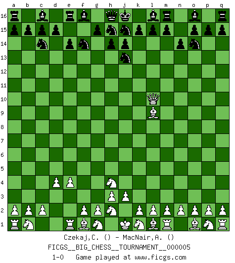 Last move : 1-0 2007 April 27 0:19:25 [Event "FICGS__BIG_CHESS__TOURNAMENT__000005"] [Site "FICGS"] [Date "2007.04.08"] [Round "1"] [White "Czekaj,Christophe"] [Black "MacNair,Adrian"] [Result "1-0"] [WhiteElo ""] [BlackElo ""] 1.j2-h4 b16-c14 2.h1-o7 p16-o14 3.o7-f15 g16-f14 4.d2-d4 e15-e14 5.f15-k11 n15-n14 6.e2-e4 k16-l14 7.c1-l9 l14-j13 8.k11-l10 1-0 Follow this game move after move (download)Chess mastery essentially consists of analyzing Chess positions accurately. (Mikhail Botvinnik) Ich erzeugte keinen Neid, da mich die Schachspieler als Musiker und die Musiker als Schachspieler betrachteten. (Mark Taimanov) Me gusta decir que Bobby Fischer fue el mejor jugador que jamás haya existido. Pero lo que hizo de Fischer un genio, fue su habilidad de mezclar una frescura y pragmatismo Americano con ideas Rusas acerca de la estrategia. (Bruce Pandolfini) La vie est comme un jeu d'échecs : nous esquissons un plan, mais celui-ci est tributaire de ce que daignent faire l'adversaire aux échecs et le destin dans la vie. (Arthur Schopenhauer) Do you know these so called Volunteers don't even get paid! (Simpsons)