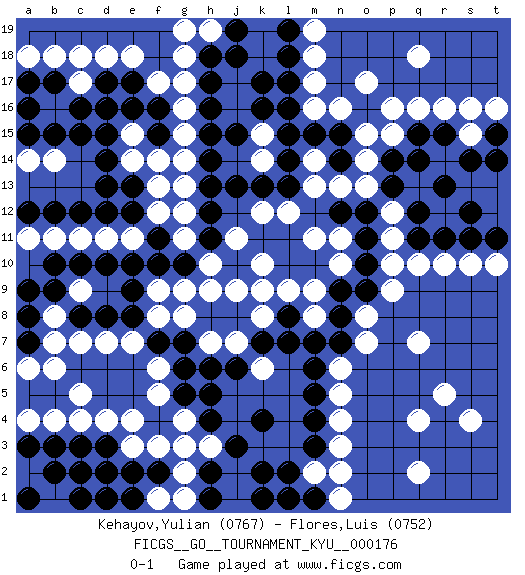 Last move : 0-1 2017 December 20 20:55:21 [Event "FICGS__GO__TOURNAMENT_KYU__000176"] [Site "FICGS"] [Date "2017.06.10"] [Round "1"] [Black "Kehayov,Yulian"] [White "Flores,Luis"] [Result "0-1"] [Rating 1 "0767"] [Rating 2 "0752"] 1.c3 q4 2.d16 q16 3.k4 q10 4.d10 k10 5.k16 d4 6.d3 e3 7.d2 e4 8.m4 n3 9.m3 m2 10.l2 n2 11.h4 g4 12.h5 h3 13.j3 g3 14.g5 f5 15.g6 f6 16.g7 e7 17.d8 c7 18.c8 d7 19.e8 f8 20.f7 g8 21.g10 g9 22.f10 f9 23.e9 h9 24.h2 g2 25.h1 g1 26.k2 n4 27.m6 n5 28.m5 n6 29.m7 l1 30.k1 k12 31.h14 m9 32.k7 b6 33.r15 h10 34.h11 r16 35.q15 p15 36.q14 s15 37.s14 s16 38.p14 o14 39.p13 o13 40.q11 p11 41.q12 r10 42.r11 p10 43.r13 p12 44.s12 m17 45.k17 s10 46.s11 b8 47.b9 g11 48.f11 g12 49.h12 g13 50.h13 b16 51.c15 c17 52.d17 d18 53.e17 e18 54.c16 f17 55.b17 c18 56.b15 b18 57.a17 c9 58.b10 c11 59.c10 a18 60.a16 s4 61.n7 o7 62.n8 o8 63.n9 n10 64.o9 g14 65.h15 g16 66.h16 g18 67.k13 l12 68.l15 o15 69.c12 b2 70.b3 b4 71.a3 b1 72.e2 c4 73.e1 p9 74.h18 h19 75.j18 g15 76.l13 m13 77.l14 c1 78.a1 a2 79.c2 d11 80.d12 e11 81.e12 b11 82.b12 f12 83.e10 a11 84.a12 e14 85.d14 e15 86.d13 q18 87.m1 n1 88.l1 l9 89.j19 g19 90.h17 q2 91.m15 k14 92.j13 j11 93.l18 m18 94.l19 m19 95.l17 k15 96.j15 m16 97.l16 o17 98.t14 p16 99.t11 t10 100.a8 b7 101.a7 a6 102.a9 a4 103.d1 f1 104.a1 b1 105.b2 a2 106.e16 b14 107.a1 a14 108.a15 a2 109.f16 g17 110.a1 r5 111.d15 a2 112.l8 k8 113.j8 k9 114.h8 j7 115.a1 h7 116.c1 c5 117.j6 j9 118.h6 m8 119.l7 k6 120.f2 f3 121.t15 t16 122.n15 n16 123.n14 n13 124.f15 f14 125.e13 m14 126.o10 n11 127.o11 f13 128.o12 q7 129.n12 m11 0-1 This go game has been lost on time (started : 2017.06.10 0:14:43) Here are the names of the openings (joseki) played in the four corners : Corner d4 : c3 d4 San-San (Sam-Sam, San-San) 3-3 Point. The San-San (3-3) point, emphasizing territory at the expense of influence. Kata-tsuki (shoulder hit). The shoulder-hit is the traditional answer to the 3-3. The direction of Black 3 depends on the positions on the side. Crawling once may be the premise for a follow-up move of sliding with a knight's move in the opposite direction. If Black plays 3 at 3-4 (to the right), the follow-on knight's move is then played at the top (e.g. 3-4, 4-5, 5-2). Black's knight's move reduces territory potential on the side it is played. Corner q4 : q4 m4 Hoshi (Hwajeom, Seongjeom, Xingwei`) 4-4 Point. The star or hoshi (4-4) point, emphasizing influence at the potential expense of territory. Corner q16 : q16 r15 Hoshi (Hwajeom, Seongjeom, Xingwei`) 4-4 Point. The star or hoshi (4-4) point, emphasizing influence at the potential expense of territory. Player White won this Go (weiqi, baduk) game. Follow this game move after move (download)Don't make dango's. (Anonymous) They say in chess you've got to kill the queen, and then you mate it... Oh I, do you ? (Red Hot Chili Peppers, Fortune faded)