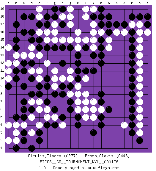 Last move : 1-0 2017 November 3 12:48:35 [Event "FICGS__GO__TOURNAMENT_KYU__000176"] [Site "FICGS"] [Date "2017.06.10"] [Round "1"] [Black "Cirulis,Ilmars"] [White "Bromo,Alexis"] [Result "1-0"] [Rating 1 "0277"] [Rating 2 "0446"] 1.d4 q16 2.d15 q4 3.k10 l7 4.k4 l13 5.n4 h10 6.k12 k16 7.k8 k7 8.h8 g11 9.k13 k14 10.j14 j15 11.l14 k15 12.m13 l12 13.l11 m12 14.n12 m14 15.m11 l15 16.n14 m15 17.n15 n16 18.o16 o17 19.n17 m16 20.p17 p16 21.o18 o15 22.h14 h15 23.g14 g15 24.f14 f15 25.q17 r17 26.r18 s17 27.s18 m17 28.r16 s16 29.r15 s15 30.r14 s14 31.r13 s13 32.r12 s12 33.o17 o14 34.n13 n18 35.r11 s11 36.r10 s10 37.r9 s9 38.r8 s8 39.r7 s7 40.r6 s6 41.r5 s5 42.r4 s4 43.r3 s3 44.j7 l8 45.j6 k9 46.j9 j8 47.h9 k8 48.d10 f12 49.d12 e13 50.e14 d13 51.c12 c13 52.b15 b13 53.f10 g10 54.f9 d14 55.e15 e11 56.c9 d11 57.c11 e10 58.e9 g9 59.g8 k6 60.k5 l5 61.m6 l6 62.m3 m5 63.n5 n6 64.n7 m7 65.o6 m6 66.n8 j10 67.f7 b12 68.b11 a11 69.b10 a10 70.a9 a12 71.e17 e16 72.d16 f16 73.f17 g17 74.g18 h18 75.h17 g16 76.f18 j17 77.h19 j18 78.m18 l18 79.n19 l19 80.s2 j19 81.g19 d17 82.d18 c17 83.c18 e19 84.b17 e18 85.c16 l10 86.k11 j11 87.h12 a14 88.b14 c4 89.c3 b3 90.c5 b4 91.c2 d3 92.e3 d2 93.e2 d5 94.d1 e4 95.c6 d3 96.f4 f5 97.g4 e6 98.d6 e7 99.d8 d7 100.c7 f6 101.g6 b2 102.b1 a2 103.t17 t16 104.t18 m19 105.n18 g5 106.h5 a4 107.b5 h4 108.e8 1-0 Here are the names of the openings (joseki) played in the four corners : Corner d16 : d15 g11 Takamoku (Gomok, Gaomu`) 5-4 Point. The takamoku (high) point (5-4). With its emphasis on influence, the 5-4 point complements the 4-4 (hoshi) point in creating an influence-oriented fuseki. Player Black won this Go (weiqi, baduk) game. Follow this game move after move (download)... {it is} something unearthly... if there are sentient beings on other planets, then they play go. (Emanuel Lasker, chess world champion) The Internet is the first thing that humanity has build that humanity doesn't understand, the largest experiment in anarchy that we have ever had. (Eric Schmidt)