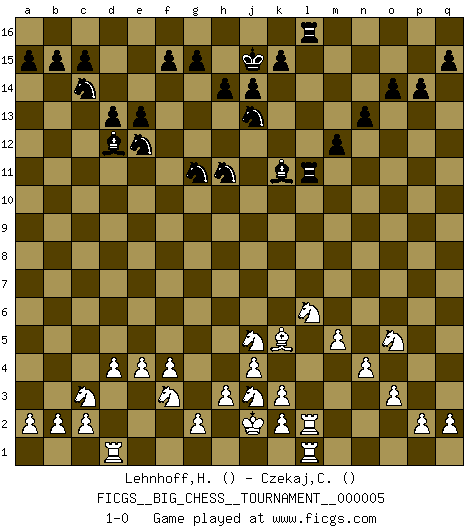 Last move : 1-0 2007 September 12 12:56:2 [Event "FICGS__BIG_CHESS__TOURNAMENT__000005"] [Site "FICGS"] [Date "2007.04.08"] [Round "1"] [White "Lehnhoff,Heinz-Georg"] [Black "Czekaj,Christophe"] [Result "1-0"] [WhiteElo ""] [BlackElo ""] 1.j2-k4 p16-o14 2.b1-c3 j15-h13 3.p1-o3 g16-f14 4.h1-o7 h16-k14 5.m2-m4 m15-m13 6.e2-e4 n15-n13 7.n2-n4 d15-d13 8.d2-d4 b16-c14 9.o1-j6 e15-e13 10.m1-m3 c16-k9 11.m3-k3 k14-f10 12.h2-g4 o16-g9 13.l1-n3 l16-o13 14.q1-n1 m16-m14 15.f1-b5 f16-b12 16.m4-m5 g9-n3 17.n1-n3 b12-c13 18.n3-n2 o13-l10 19.o7-o6 k16-l14 20.c1-l9 j16-j15 21.a1-d1 o14-n12 22.l9-h12 f10-f12 23.h12-l15 m14-o14 24.o6-k10 m13-m12 25.l15-c7 l14-j13 26.k4-l6 k9-g6 27.j3-j4 o14-k14 28.k10-o6 k14-k3 29.l2-k3 o15-o14 30.f2-f4 e16-l16 31.g4-j5 g6-k9 32.o6-p7 p15-p14 33.k1-j3 l16-l11 34.p7-n5 f12-f7 35.c7-e5 l11-n11 36.n5-k8 n11-k11 37.k8-c8 c13-d12 38.b5-c4 f7-p7 39.c4-k11 l10-k11 40.o3-q4 k9-g12 41.c8-f5 n12-l11 42.o2-o3 q16-l16 43.j1-j2 g12-k9 44.e5-l11 l16-l11 45.f5-k9 a16-l16 46.q4-o5 p7-f7 47.k9-f9 f7-f9 48.j6-f9 h13-g11 49.f9-k5 h15-g13 50.g1-f3 f14-e12 51.e1-l1 g13-h11 52.n2-l2 1-0 Follow this game move after move (download)Not all artists are Chess players, but all Chess players are artists. (Marcel Duchamp) Das Spiel gibt uns die Genugtuung, die das Leben uns versagt. (Emanuel Lasker) Por la belleza de sus partidas, la claridad de su juego y lo brillante de sus ideas, Fischer se creó el mismo como un artista de la misma estatura como Brahms, Rembrandt y Shakespeare. (David Levy) Aucun coup ne doit être joué sans but. (Pedro Damiano) An expert is a man who has made all the mistakes which can be made in a very narrow field. (Niels Bohr)