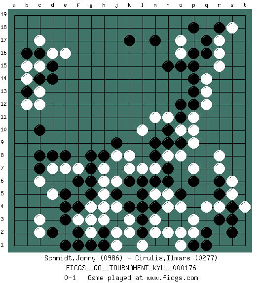Last move : 0-1 2017 November 7 23:11:12 [Event "FICGS__GO__TOURNAMENT_KYU__000176"] [Site "FICGS"] [Date "2017.06.10"] [Round "1"] [Black "Schmidt,Jonny"] [White "Cirulis,Ilmars"] [Result "0-1"] [Rating 1 "0986"] [Rating 2 "0277"] 1.q16 r4 2.c16 d5 3.c10 o17 4.k17 q13 5.m17 o16 6.p14 q14 7.p15 r17 8.q17 r16 9.p13 q12 10.p12 p11 11.o11 o10 12.p16 n11 13.o12 p10 14.n10 m11 15.n9 o8 16.r18 s18 17.p18 l10 18.o15 n8 19.j5 r15 20.n15 e16 21.j3 c17 22.n3 p3 23.c14 d16 24.c7 c3 25.j9 c15 26.r6 r8 27.e3 c6 28.r3 q4 29.m9 k8 30.m6 l7 31.p6 n4 32.m4 n5 33.n6 m5 34.l6 m3 35.l4 n2 36.l3 m2 37.b16 b15 38.l5 d7 39.c8 c12 40.d8 e7 41.e8 f7 42.o5 o4 43.s4 s5 44.s2 t4 45.s3 s6 46.q2 p2 47.p1 o1 48.q1 g3 49.f4 g4 50.g5 e2 51.d2 f5 52.e5 f3 53.e4 h5 54.g6 h6 55.g7 h7 56.g8 j4 57.k4 h4 58.f6 c2 59.f2 g2 60.e1 k2 61.h2 k3 62.g1 j2 63.d15 b14 64.l2 h3 65.o3 o2 66.r5 r7 67.j7 j8 68.h8 j6 69.m8 m7 70.o9 p9 71.n7 p7 72.k6 k7 73.h1 j1 74.f1 l1 75.b13 c13 76.d14 b12 0-1 Here are the names of the openings (joseki) played in the four corners : Corner q16 : q16 o17 Hoshi (Hwajeom, Seongjeom, Xingwei`) 4-4 Point. The star or hoshi (4-4) point, emphasizing influence at the potential expense of territory. Ikken Kakari (Hankan Keolch'im, Yi Gua`jiao~, 1-Space Low Approach). White 2 is the standard approach move to the 4-4. Corner q4 : r4 n9 Komoku (Somok, Xiao~mu`) 3-4 Point. The komoku (3-4) point is the traditional corner enclosure move.. Corner d4 : d5 j5 Takamoku (Gomok, Gaomu`) 5-4 Point. The takamoku (high) point (5-4). With its emphasis on influence, the 5-4 point complements the 4-4 (hoshi) point in creating an influence-oriented fuseki. Corner d16 : c16 e16 Komoku (Somok, Xiao~mu`) 3-4 Point. The komoku (3-4) point is the traditional corner enclosure move.. Ikken Takagakari (Hankan Nop'dakeolch'im, Yi Gaogua`jiao~, 1-Space High Approach). The 5-4 approach move has become more popular in modern times, as modern Go emphasizes speed and influence. Player White won this Go (weiqi, baduk) game. Follow this game move after move (download)If you cannot succeed, then die gloriously. (Chinese proverb) In every real man a child is hidden that wants to play. (Friedrich Nietzsche)
