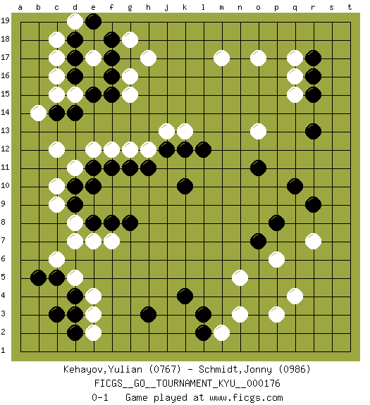 Last move : 0-1 2017 October 22 0:12:4 [Event "FICGS__GO__TOURNAMENT_KYU__000176"] [Site "FICGS"] [Date "2017.06.10"] [Round "1"] [Black "Kehayov,Yulian"] [White "Schmidt,Jonny"] [Result "0-1"] [Rating 1 "0767"] [Rating 2 "0986"] 1.c3 q16 2.d16 q4 3.k4 c12 4.d10 m17 5.q10 c9 6.d9 c10 7.k10 d11 8.e10 d8 9.e8 e7 10.f8 d7 11.e11 e12 12.f11 n3 13.l3 f12 14.g11 g12 15.h11 f7 16.g8 r7 17.p8 h17 18.r9 e3 19.d4 e4 20.d3 d5 21.c5 h12 22.j12 j13 23.k12 p3 24.h3 c17 25.d17 c16 26.f17 d15 27.e15 c18 28.d18 g18 29.f18 g16 30.d14 c15 31.f16 g15 32.f15 d19 33.e19 e17 34.c14 b14 35.r15 o17 36.r16 q17 37.r17 k13 38.l12 p6 39.o7 o13 40.o11 q15 41.r13 c6 42.b5 e2 43.d2 m2 44.l2 n5 0-1 This go game has been lost on time (started : 2017.06.10 0:14:43) Here are the names of the openings (joseki) played in the four corners : Corner d16 : d16 c12 Hoshi (Hwajeom, Seongjeom, Xingwei`) 4-4 Point. The star or hoshi (4-4) point, emphasizing influence at the potential expense of territory. Corner d4 : c3 c9 San-San (Sam-Sam, San-San) 3-3 Point. The San-San (3-3) point, emphasizing territory at the expense of influence. Player White won this Go (weiqi, baduk) game. Follow this game move after move (download)Connect with good shape. (Anonymous) When it is a question of money, everybody is of the same religion. (Voltaire)