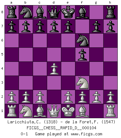 Last move : 0-1 2017 August 12 14:47:17 [Event "FICGS__CHESS__RAPID_D__000104"] [Site "FICGS"] [Date "2017.06.15"] [Round "1"] [White "Laricchiuta,Claudio"] [Black "de la Foret,Fred"] [Result "0-1"] [WhiteElo "1318"] [BlackElo "1547"] 1.d4 f5 2.Nf3 Nf6 0-1 This chess game has been lost on time (started : 2017.06.15 12:46:14) Dutch Player Black won this chess game. Follow this game move after move (download)In Chess, at least, the brave inherit the earth. (Edmar Mednis) Woher wissen wir, daß der Neanderthaler Blindschach gespielt hat? -- Bei Ausgrabungen wurden keine Schachbretter und Figuren gefunden. (Anonymous) Una buena ofensiva y una buena defensa, comienzan ambas con un buen desarrollo. (Bruce A. Moon) Le génie consiste à savoir transgresser les règles au moment opportun. (Teichmann) True nature is revealed in times of difficulty. (Chinese proverb)