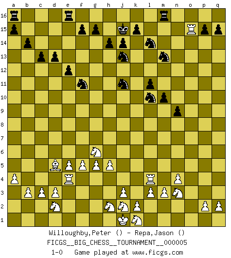 Last move : 1-0 2007 June 23 16:49:42 [Event "FICGS__BIG_CHESS__TOURNAMENT__000005"] [Site "FICGS"] [Date "2007.04.08"] [Round "1"] [White "Willoughby,Peter"] [Black "Repa,Jason"] [Result "1-0"] [WhiteElo ""] [BlackElo ""] 1.n2-n4 j15-k13 2.o1-d11 h16-o10 3.m2-m3 o10-o2 4.m1-m2 o2-d12 5.d11-a8 d15-d13 6.p1-o3 c16-k9 7.c2-c3 e15-e13 8.g2-g4 f16-b12 9.l2-l3 b16-c14 10.d2-d3 e13-e12 11.h1-d5 p16-o14 12.d5-d12 c14-d12 13.m2-l2 m15-m13 14.l1-n3 c15-c13 15.h3-h4 l16-o13 16.q1-o1 n15-n14 17.g1-h3 o16-f8 18.e2-e4 m13-m12 19.b1-d2 g16-j15 20.f2-f4 n14-n13 21.a2-a4 m12-m11 22.f4-f5 m11-m10 23.o3-m4 n13-n12 24.o1-o13 n12-n11 25.o13-o9 k9-m11 26.o9-o11 q16-n16 27.b2-b3 k16-l14 28.c1-a3 l14-m12 29.o11-o5 n11-n10 30.a3-f8 b12-f8 31.h3-j5 l15-l13 32.g4-g5 l13-l12 33.f1-n8 m11-l10 34.n8-l10 m12-l10 35.e4-e5 l12-l11 36.e1-e4 b15-b14 37.a8-d5 n16-n15 38.j5-g6 f8-g9 39.l2-o2 n10-n9 40.m4-l2 g9-n3 41.l2-n3 h15-j13 42.a1-g1 j15-l14 43.g1-g4 j16-j15 44.h4-h5 d12-f11 45.g4-l4 k13-j11 46.o5-o11 o14-m13 47.o11-o15 n15-o15 48.o2-o15 1-0 Comment by player 1 : Peter Willoughby : That is not very polite!!!! Comment by player 2 : Jason Repa : Anyway, good game. Well played by you. I didn't even realize I was down a bishop until recently. I have to start spending more than 10 seconds/move for my big chess games. Follow this game move after move (download)Live, lose, and learn, by observing your opponent how to win. (Amber Steenbock) Die jungen Leute sollen verstehen, dass sie noch etwas von mir lernen können und müssen. (Viktor Kortschnoi) Mis oponentes también hacen buenas movidas. A veces yo no tomo esas cosas en consideración. (Bobby Fischer) A ce moment-là, je menaçais de comprendre la position ! (Clément L'Heureux) Whoever said the pen is mightier than the sword obviously never encountered automatic weapons. (US General Douglas MacArthur)