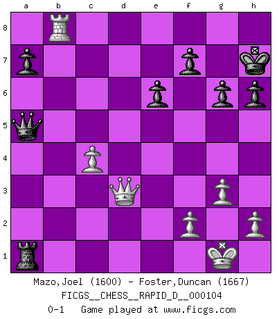Last move : 0-1 2017 October 13 23:6:15 [Event "FICGS__CHESS__RAPID_D__000104"] [Site "FICGS"] [Date "2017.06.15"] [Round "1"] [White "Mazo,Joel"] [Black "Foster,Duncan"] [Result "0-1"] [WhiteElo "1600"] [BlackElo "1667"] 1.d4 b6 2.Nf3 Bb7 3.e3 Nf6 4.Bd3 e6 5.Nbd2 Be7 6.O-O O-O 7.c3 d6 8.e4 d5 9.Qc2 dxe4 10.Nxe4 Nbd7 11.Rd1 h6 12.b3 c5 13.dxc5 Qc7 14.cxb6 Qxb6 15.Be3 Qc7 16.c4 Ne5 17.Nxe5 Qxe5 18.Nxf6+ Bxf6 19.Bd4 Qg5 20.Be4 Bxe4 21.Qxe4 Bxd4 22.Rxd4 Rad8 23.Rad1 Rxd4 24.Qxd4 Qa5 25.a4 Rb8 26.Rb1 Rxb3 27.Ra1 Ra3 28.Rb1 Rxa4 29.Rb8+ Kh7 30.Qd3+ g6 31.g3 Ra1+ 0-1 This chess game has been lost on time (started : 2017.06.15 12:46:14) Queen's pawn : English defense Kingside Castling by player White (move 6) Kingside Castling by player Black (move 6) Player Black won this chess game. Follow this game move after move (download)Combinations have always been the most intriguing aspect of Chess. The masters look for them, the public applauds them, the critics praise them. It is because combinations are possible that Chess is more than a lifeless mathematical exercise. They are the poetry of the game; they are to Chess what melody is to music. They represent the triumph of mind over matter. (Reuben Fine) Schach ist Leben. (Robert James Fischer) La partida mas dura de ganar es una partida ganada. (Emanuel Lasker) Plusieurs personnes se sont demandées comment Tal faisait pour gagner... En fait, c'est très simple ! Il met ses pièces au centre de l'échiquier et les sacrifie quelque part ! (David Bronstein) The existence of forgetting has never been proved: We only know that some things don't come to mind when we want them. (Friedrich Nietzsche)