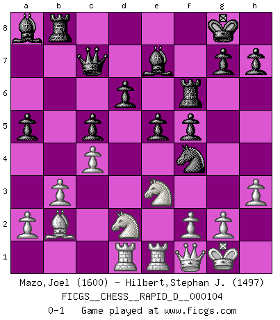 Last move : 0-1 2017 October 8 22:32:35 [Event "FICGS__CHESS__RAPID_D__000104"] [Site "FICGS"] [Date "2017.06.15"] [Round "1"] [White "Mazo,Joel"] [Black "Hilbert,Stephan J."] [Result "0-1"] [WhiteElo "1600"] [BlackElo "1497"] 1.d4 Nf6 2.Nf3 e6 3.e3 b6 4.Bd3 Bb7 5.O-O Be7 6.Nbd2 c5 7.c3 O-O 8.dxc5 bxc5 9.e4 d6 10.Qc2 e5 11.Re1 Qc7 12.b3 Nc6 13.Bb2 Rab8 14.h3 Nd8 15.Rad1 Ne6 16.Nf1 Nf4 17.Ne3 Nxd3 18.Qxd3 Bxe4 19.Qe2 a5 20.Ng4 Ba8 21.Nd2 Nd5 22.Ne3 Nf4 23.Qf1 f5 24.c4 Rf6 0-1 This chess game has been lost on time (started : 2017.06.15 12:46:14) Queen's pawn : Yusupov-Rubinstein system Kingside Castling by player White (move 5) Kingside Castling by player Black (move 7) Player Black won this chess game. Follow this game move after move (download)Dazzling combinations are for the many, shifting wood is for the few. (Georg Kieninger) Im Blitz ist es einfacher mit einer Figur weniger anzugreifen, als sich mit einer Mehrfigur zu verteidigen. (Mikhail Nekhemyevich Tal) Las Aperturas te enseñan aperturas. ¡Los Finales te enseñan Ajedrez!. (Stephan Gerzadowicz) Il n'y a pas eu de défaite parce que je ne crois pas que cet ordinateur ait jamais existé. IBM a triché en refusant d'imprimer les modes de recherche de la machine. C'est évident, pendant le match, des coups décisifs ont été joués par des êtres humains. Aujourd'hui, les meilleurs spécialistes en informatique ne peuvent toujours pas expliquer comment Deep-Blue a pu jouer contre la logique des ordinateurs. IBM a gagné une guerre de communication, mais ils sont incapables de prouver que l'ordinateur a gagné tout seul. (Garry Kasparov) It is the aim of the modern school, not to treat every position according to one general law, but according to the principle inherent in the position. (Richard Reti)