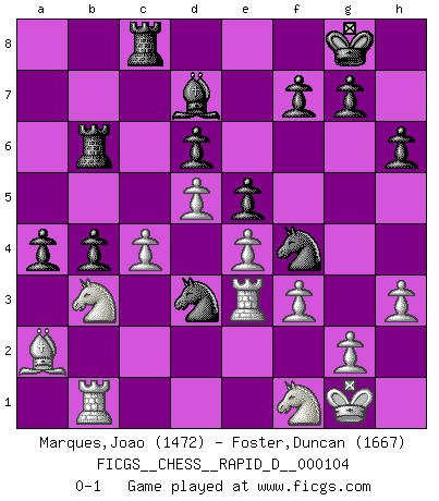 Last move : 0-1 2017 October 11 16:20:13 [Event "FICGS__CHESS__RAPID_D__000104"] [Site "FICGS"] [Date "2017.06.15"] [Round "1"] [White "Marques,Joao"] [Black "Foster,Duncan"] [Result "0-1"] [WhiteElo "1472"] [BlackElo "1667"] 1.e4 e5 2.Nf3 Nc6 3.Bb5 a6 4.Ba4 Nf6 5.O-O b5 6.Bb3 Bc5 7.c3 d6 8.Bc2 O-O 9.Re1 Bb6 10.d4 Bg4 11.d5 Ne7 12.Bg5 Ng6 13.Nbd2 h6 14.Be3 Rb8 15.h3 Bd7 16.Bxb6 Rxb6 17.Rb1 Nf4 18.Nf1 Qc8 19.N3h2 c5 20.b3 c4 21.bxc4 Qxc4 22.Qd2 Qxa2 23.Bb3 Qxd2 24.Nxd2 Nd3 25.Re3 Nc5 26.Ba2 Rc8 27.c4 b4 28.f3 Nh5 29.Kf2 Nf4 30.Nhf1 a5 31.Nb3 Ncd3+ 32.Kg1 a4 0-1 Ruy Lopez : 5.O-O Kingside Castling by player White (move 5) Kingside Castling by player Black (move 8) Player Black won this chess game. Follow this game move after move (download)The tactician knows what to do when there is something to do; whereas the strategian knows what to do when there is nothing to do. (Gerald Abrahams) Es ist im Leben wie im Schachspiel. Wir entwerfen einen Plan, dieser bleibt jedoch bedingt durch das, was im Schachspiel dem Gegner, im Leben dem Schicksal zu tun belieben wird. (Arthur Schopenhauer) En un gambito tu regalas un Peón por el bién de tomar un juego perdido. (Samuel Standige Boden) Ne tendez aucun piège pour le plaisir ! Ne jouez rien dans l'espoir que l'adversaire réagisse de façon stupide ! Prenez toujours pour acquis que l'adversaire va trouver le meilleur coup ! Ne jouez jamais de coup dans l'espoir que l'adversaire ne voie pas la menace ! Chacun de vos coups doit améliorer la position d'une façon ou d'une autre. A proverb is a short sentence based on long experience. (Miguel de Cervantes)