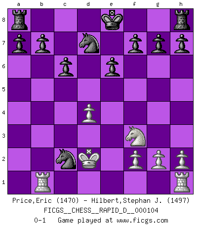 Last move : 0-1 2017 September 14 20:49:42 [Event "FICGS__CHESS__RAPID_D__000104"] [Site "FICGS"] [Date "2017.06.15"] [Round "1"] [White "Price,Eric"] [Black "Hilbert,Stephan J."] [Result "0-1"] [WhiteElo "1470"] [BlackElo "1497"] 1.e4 d5 2.exd5 Qxd5 3.Nc3 Qa5 4.d4 Nf6 5.Nf3 Bf5 6.Bc4 e6 7.Bd2 c6 8.Qe2 Bb4 9.O-O-O Nbd7 10.a3 Bxa3 11.Nd5 Bb4 12.Bxb4 Qa1+ 13.Kd2 Qxb2 14.Bd3 Nxd5 15.Rb1 Bxd3 16.Qxd3 Nxb4 17.Qc4 Qxc2+ 18.Qxc2 Nxc2 0-1 Scandinavian defense Queenside Castling by player White (move 9) Player Black won this chess game. Follow this game move after move (download)On the chessboard, lies and hypocrisy do not survive long. (Emanuel Lasker) Ich verstehe Aljechins Kombinationen ganz gut; aber woher er diese Angriffschancen bekommt und wie er die Eröffnung behandelt das ist für mich ein Buch mit sieben Siegeln. (Rudolf Spielmann) Observen a Garry Kasparov. Después de una derrota, invariablemente el gana la próxima partida. Prácticamente hace pedazos a su siguiente oponente. Eso es algo que tenemos que aprender a lograr. (Maurice Ashley) À la honte des hommes, on sait que les lois du jeu sont les seules qui soient partout justes, claires, inviolables et exécutées. Pourquoi l'Indien qui a donné les règles du jeu d'échecs est-il obéi de bon gré dans toute la terre, et que les décrétales des papes, par exemple, sont aujourd'hui un objet d'horreur et de mépris ? C'est que l'inventeur des échecs combina tout avec justesse pour la satisfaction des joueurs, et que les papes, dans leurs décrétales, n'eurent en vue que leur seul avantage. L'Indien voulut exercer également l'esprit des hommes et leur donner du plaisir; les papes ont voulu abrutir l'esprit des hommes. Voltaire (Dictionnaire philosophique / Garnier 1967) A woman without a man is like a fish without a bicycle. (Gloria Steinem)