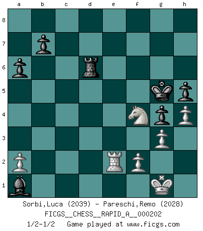 Last move : 1/2-1/2 2017 October 7 2:0:40 [Event "FICGS__CHESS__RAPID_A__000202"] [Site "FICGS"] [Date "2017.06.16"] [Round "1"] [White "Sorbi,Luca"] [Black "Pareschi,Remo"] [Result "1/2-1/2"] [WhiteElo "2039"] [BlackElo "2028"] 1.e4 e5 2.Nf3 Nc6 3.Bb5 a6 4.Ba4 d6 5.c3 f5 6.exf5 Bxf5 7.O-O Bd3 8.Re1 Be7 9.Bc2 Bxc2 10.Qxc2 g5 11.d4 g4 12.Nfd2 Nf6 13.Ne4 Qd7 14.Nxf6+ Bxf6 15.Nd2 O-O 16.d5 Ne7 17.Ne4 Nxd5 18.Qd1 Qe6 19.Bh6 Rf7 20.c4 Ne7 21.Bg5 Bg7 22.Qb3 Rb8 23.Bxe7 Rxe7 24.Rad1 Rd7 25.Ng5 Qf5 26.c5 Kh8 27.Ne4 dxc5 28.Rxd7 Qxd7 29.g3 h6 30.Nxc5 Qc6 31.Nd3 Re8 32.Qb4 e4 33.Nf4 Kh7 34.Qb3 Re7 35.Qd1 Qd7 36.Qxd7 Rxd7 37.Rxe4 Bxb2 38.Ne6 Rd6 39.Nxc7 h5 40.Ne6 Kg6 41.Re2 Ba1 42.Nf4+ Kg5 43.h4+ 1/2-1/2 Ruy Lopez : Siesta, Kopayev variation Kingside Castling by player White (move 7) Kingside Castling by player Black (move 15) This chess game ended in a draw. Follow this game move after move (download)There's never before been a Chess player with such a thorough knowledge of the intricacies of the game and such an absolutely indomitable will to win. I think Bobby is the greatest player that ever lived. (Lisa Lane) Im Fernschach kannst du während dem Spiel rauchen. (John Christen Knudsen) La partida mas dura de ganar es una partida ganada. (Emanuel Lasker) Il n'y a plus de joueurs du niveau de Jacob Murray dont la seule quête est le beau jeu, le plaisir de voir les pièces construire quelque chose. Sur 10 idées à la minute, 9 seront sans intérêt, la dernière s'avèrera géniale. (Christian Bauer) No enterprise is more likely to succeed than one concealed from the enemy until it is ripe for execution. (Niccolo Machiavelli)