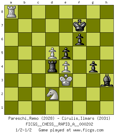 Last move : 1/2-1/2 2018 January 19 12:16:42 [Event "FICGS__CHESS__RAPID_A__000202"] [Site "FICGS"] [Date "2017.06.16"] [Round "1"] [White "Pareschi,Remo"] [Black "Cirulis,Ilmars"] [Result "1/2-1/2"] [WhiteElo "2028"] [BlackElo "2031"] 1.c4 e6 2.d4 b6 3.e4 Bb7 4.Bd3 Bb4+ 5.Kf1 Be7 6.Nc3 d6 7.f4 e5 8.fxe5 dxe5 9.d5 c6 10.Nf3 Nd7 11.g3 Ngf6 12.Kg2 O-O 13.Qe2 cxd5 14.cxd5 Nc5 15.Bc2 Ba6 16.Qd1 Qb8 17.h3 Rd8 18.Re1 Ncd7 19.Bg5 h6 20.Bd3 Bc8 21.Be3 Nc5 22.Rc1 Nxd3 23.Qxd3 Nd7 24.Qd2 Ba6 25.Nh4 Nf6 26.Nf5 Bf8 27.g4 Ne8 28.Kh2 f6 29.Rg1 Qc7 30.Qf2 Qf7 31.a4 Rab8 32.Ra1 Rbc8 33.Rg2 Nd6 34.Rc1 Nc4 35.Qf3 Nxe3 36.Nxe3 Rc7 37.Ra1 Qe8 38.Nf5 Rf7 39.a5 bxa5 40.Rxa5 Bc8 41.Ra1 R8d7 42.h4 Qd8 43.Nd1 Rb7 44.Rc1 a5 45.h5 Rb8 46.Rd2 Rfb7 47.Qg2 Bb4 48.Rf2 Bd7 49.Nde3 a4 50.Rfc2 Kh7 51.Rd1 Rc8 52.Rdc1 Rxc2 53.Rxc2 Qb8 54.Nh4 Be1 55.Nef5 Rb3 56.Qe2 a3 57.bxa3 Bxh4 58.Nxh4 Rxa3 59.Ng6 Qb3 60.Qg2 Qe3 61.Nf8+ Kg8 62.Ng6 Ra8 63.Ra2 Re8 64.Rc2 Qg5 65.Qg3 Bxg4 66.Rg2 Bd1 67.Nh4 Kh7 68.Nf5 Rg8 69.Qxg5 hxg5 70.Kg3 Rb8 71.Ra2 Rb3+ 72.Kf2 Rb7 73.Ng3 Bg4 74.Ra8 g6 75.hxg6+ Kxg6 76.Nf1 Rb4 77.Nd2 Bd7 78.Rd8 Bh3 79.Rg8+ Kf7 80.Ra8 g4 81.Ke3 Rd4 1/2-1/2 English Opening Kingside Castling by player Black (move 12) This chess game ended in a draw. Follow this game move after move (download)Life is like a game of Chess, changing with each move. (Chinese proverb) Die Leute spielen gegen mich seit 15 Jahren unter Ihren Möglichkeiten. (Robert James Fischer) El Ajedrez es imaginación. (David Bronstein) Même si vous avez un bon coup à faire, regardez toujours s'il n'y en a pas un qui lui soit préférable. (Pedro Damiano) Panic is a sudden desertion of us, an a going over to the enemy of our imagination. (Christian Nevell Bovee)